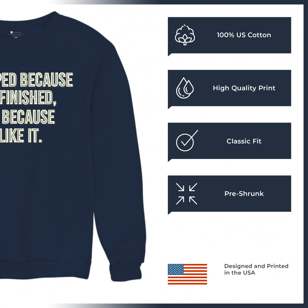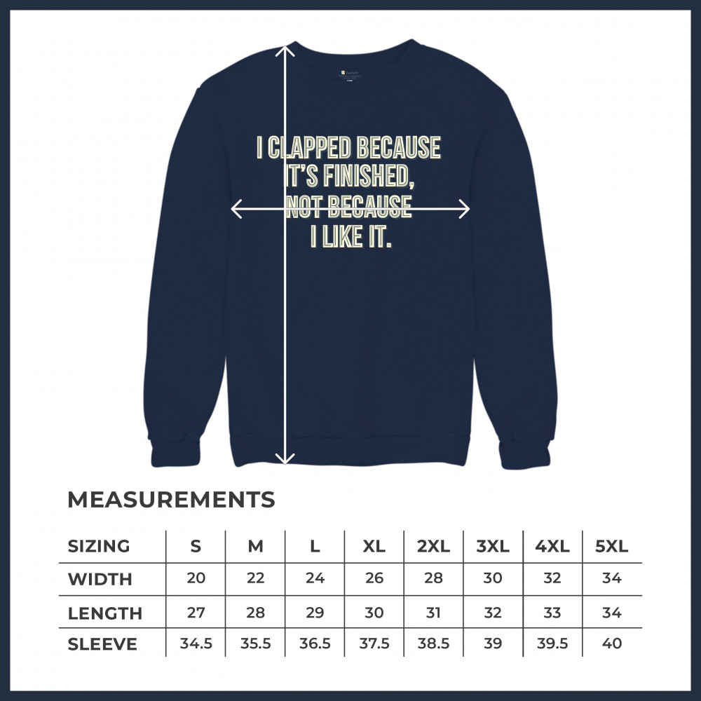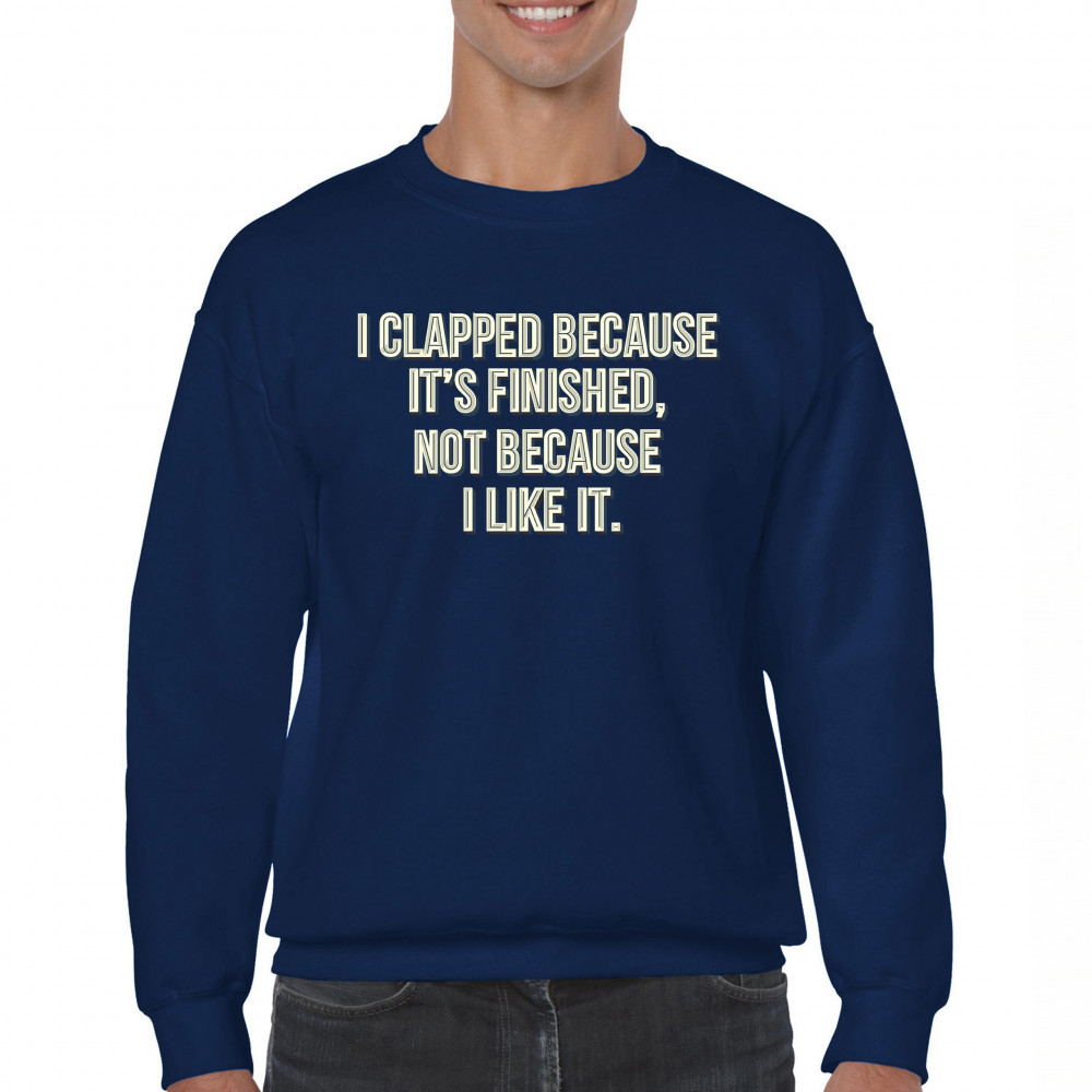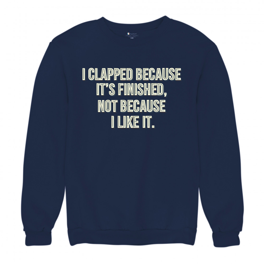 I CLAPPED BECAUSE IT'S FINISHED NOT BECAUSE I LIKE IT sweatshirt funny crewneck navy blue