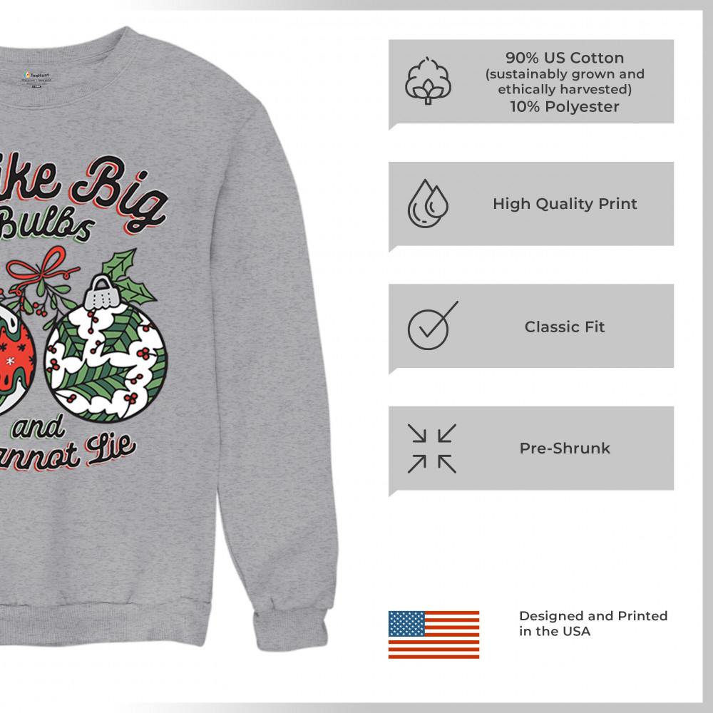 Light up the holiday season with our "I Like Big Bulbs" design, a playful and festive addition to any celebration. This unique design is perfect for cozy family gatherings, office parties, or Secret Santa exchanges, adding a humorous twist to your holiday wardrobe. Ideal for matching group outfits or gift exchanges, it captures the Christmas spirit in a fun and memorable way. From jolly gatherings to festive gift ideas, this design brings cheer to every holiday event.
