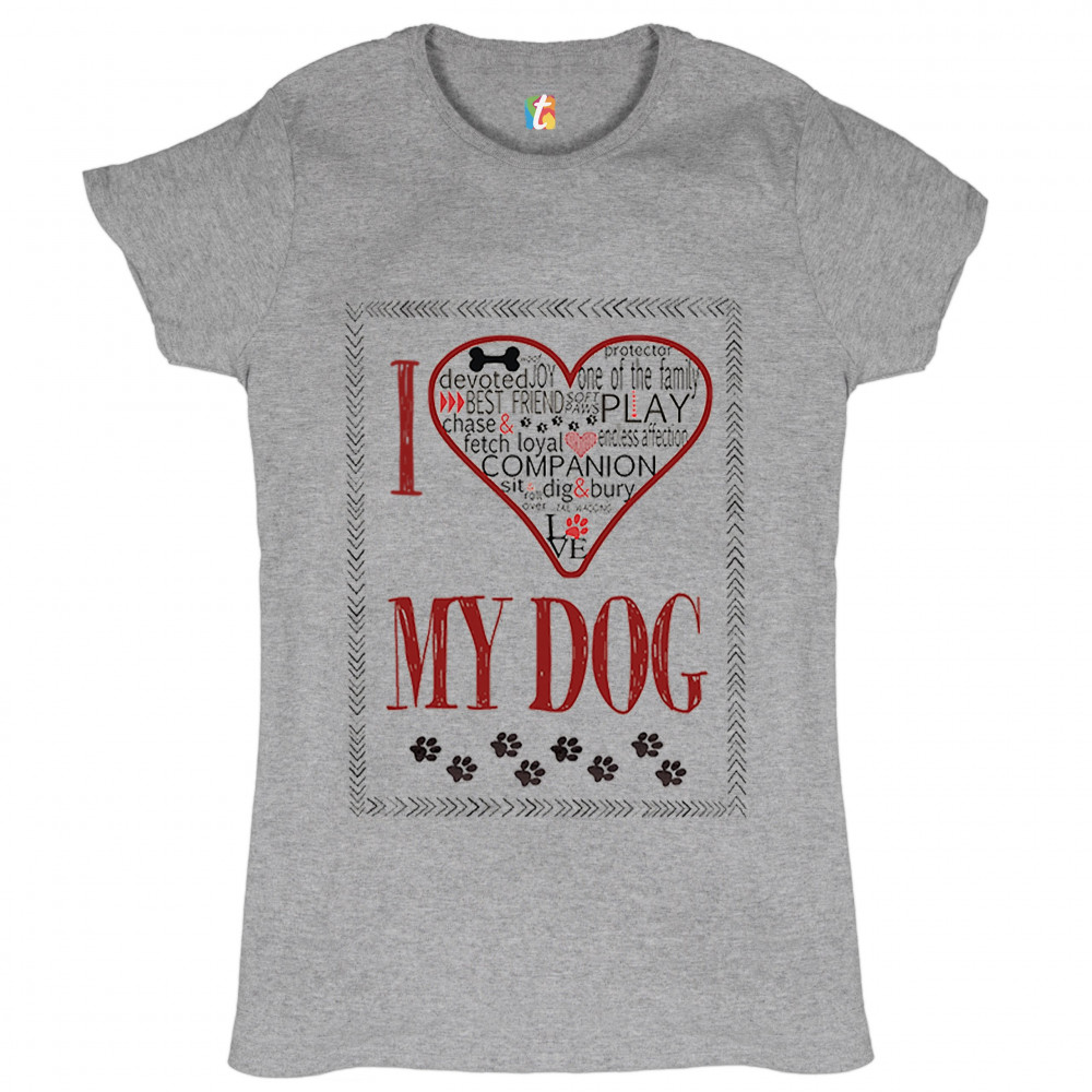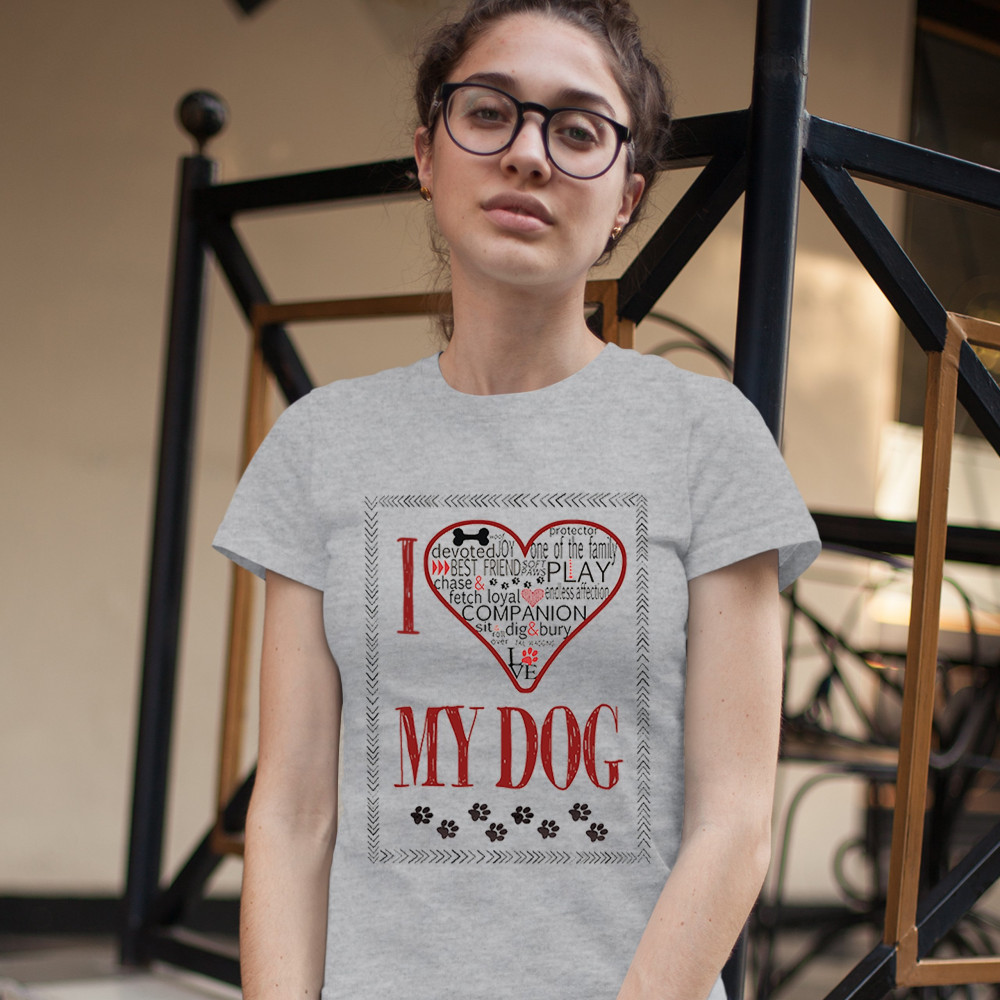 A sweet print featuring a frame inside of which, there are dog tracks and the phrase "I love my dog" in which "love" is replaced with a huge heart. The heart is filled with numerous compliments a beloved dog can be described with. A great choice for any d