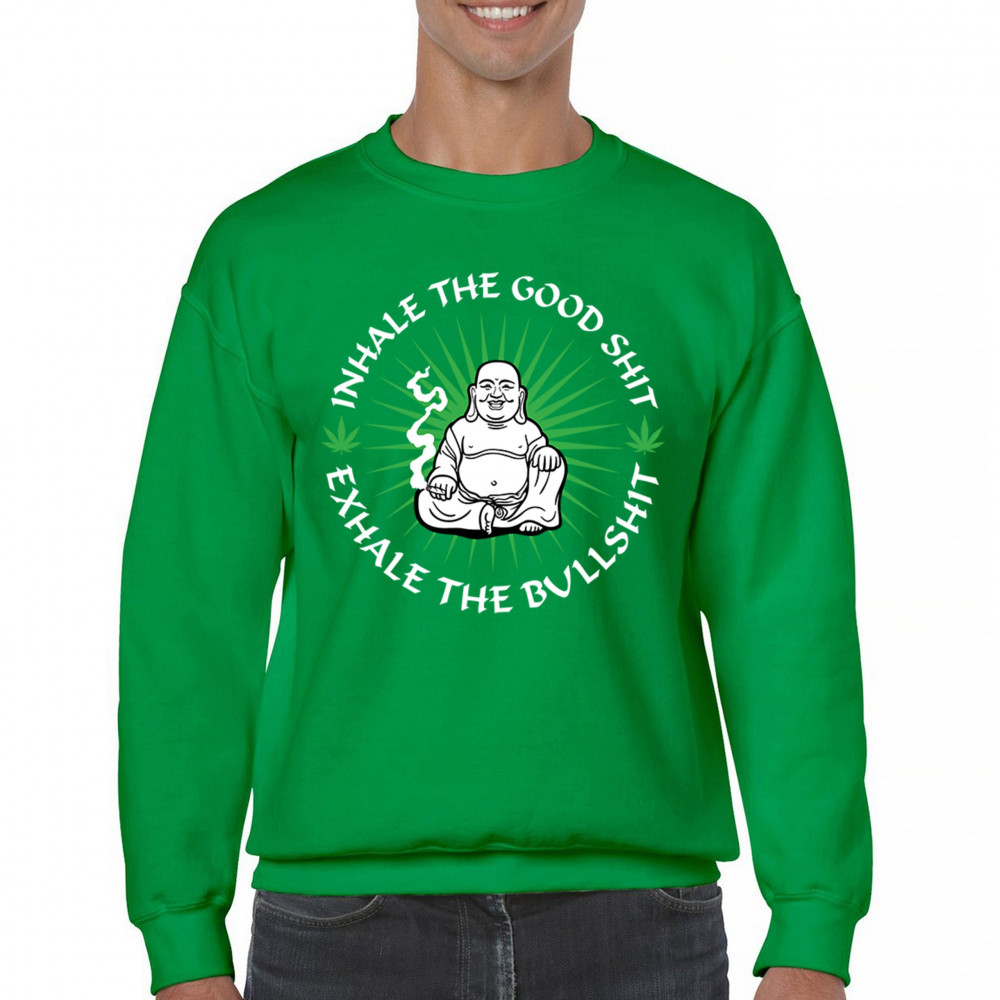 Stoner Buddha design with weed leaves and funny zen slogan—perfect for chill 420 lovers who inhale peace and exhale the BS.