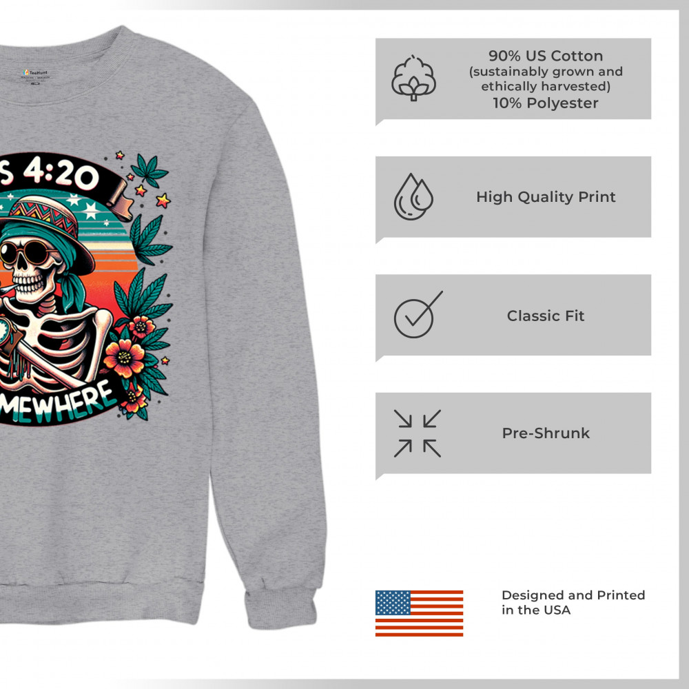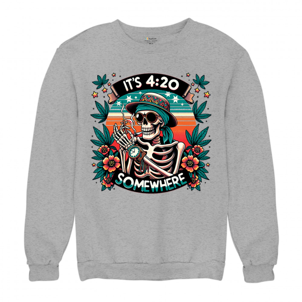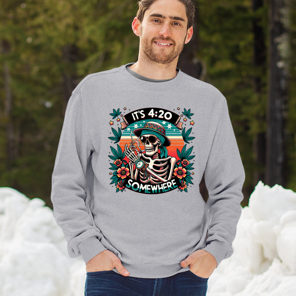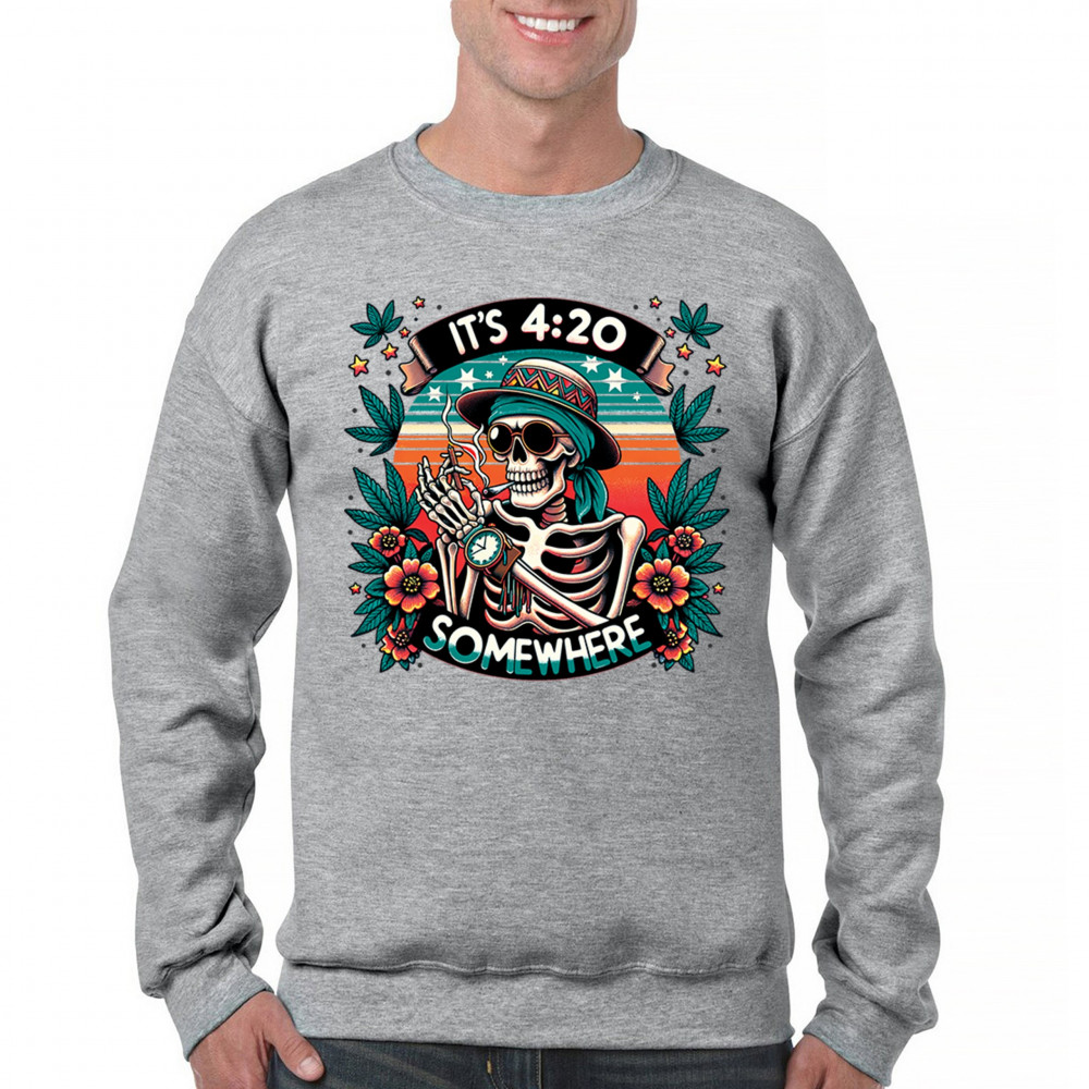 Get lifted with this “It’s 4:20 Somewhere†design featuring a joint-smoking skeleton, tropical sunset, and Deadhead stoner vibes. With bold trippy colors and beachy weed art, this tee is perfect for April 20 parties, summer festivals, and cannabis lovers living the high life.