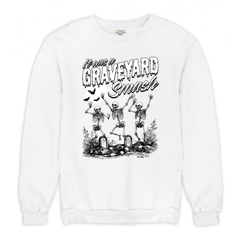 Celebrate Halloween with a fun "Graveyard Smash" design featuring dancing skeletons. Perfect for parties and haunted house events!