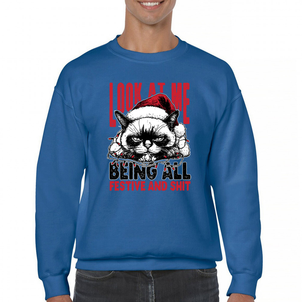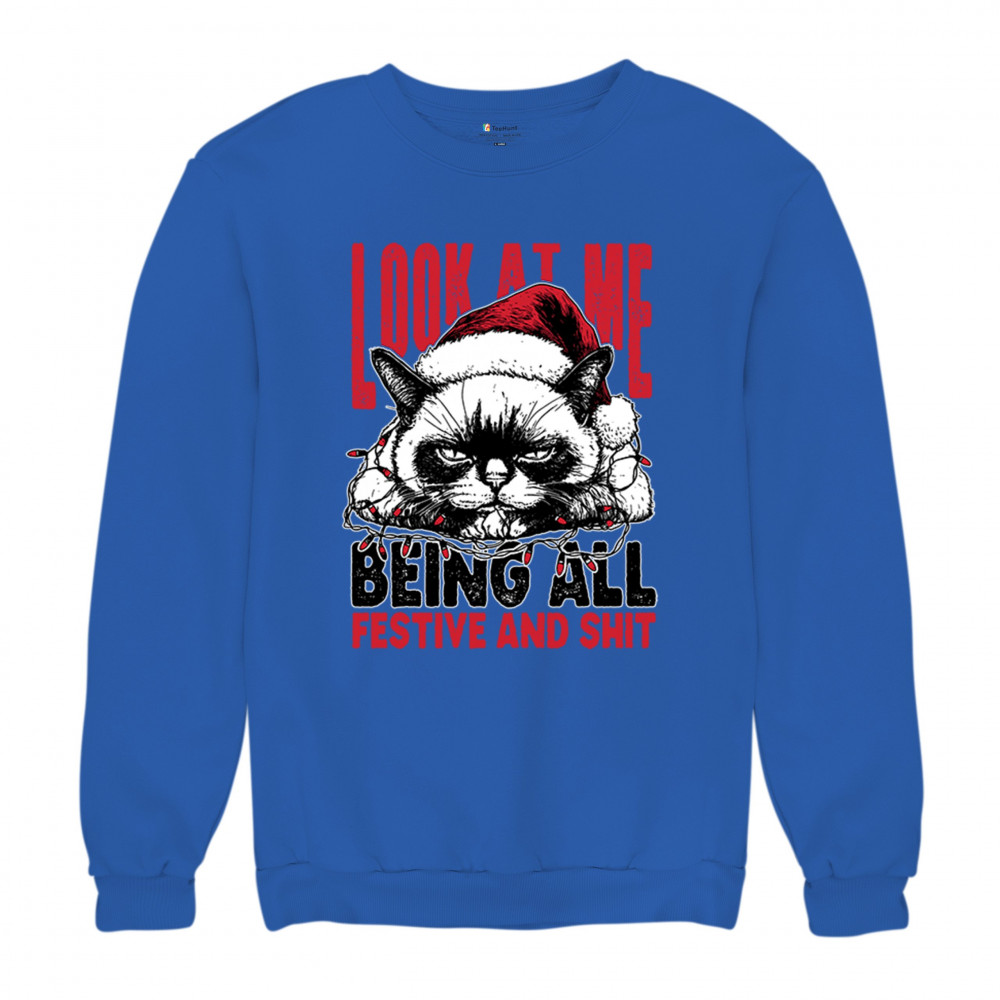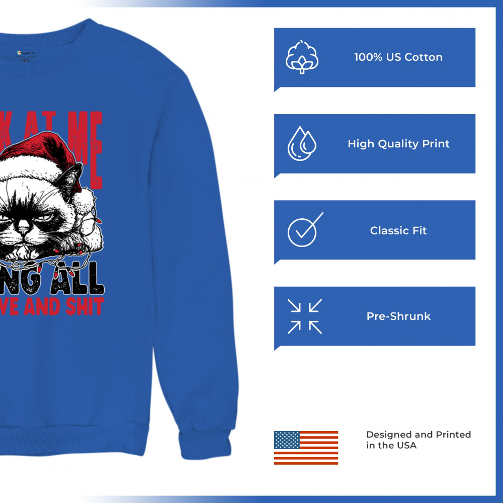 Grumpy Cat Christmas design with Santa hat, Christmas tree humor, Let It Snow vibes, Jingle Bells style, and sarcastic Merry Xmas spirit.