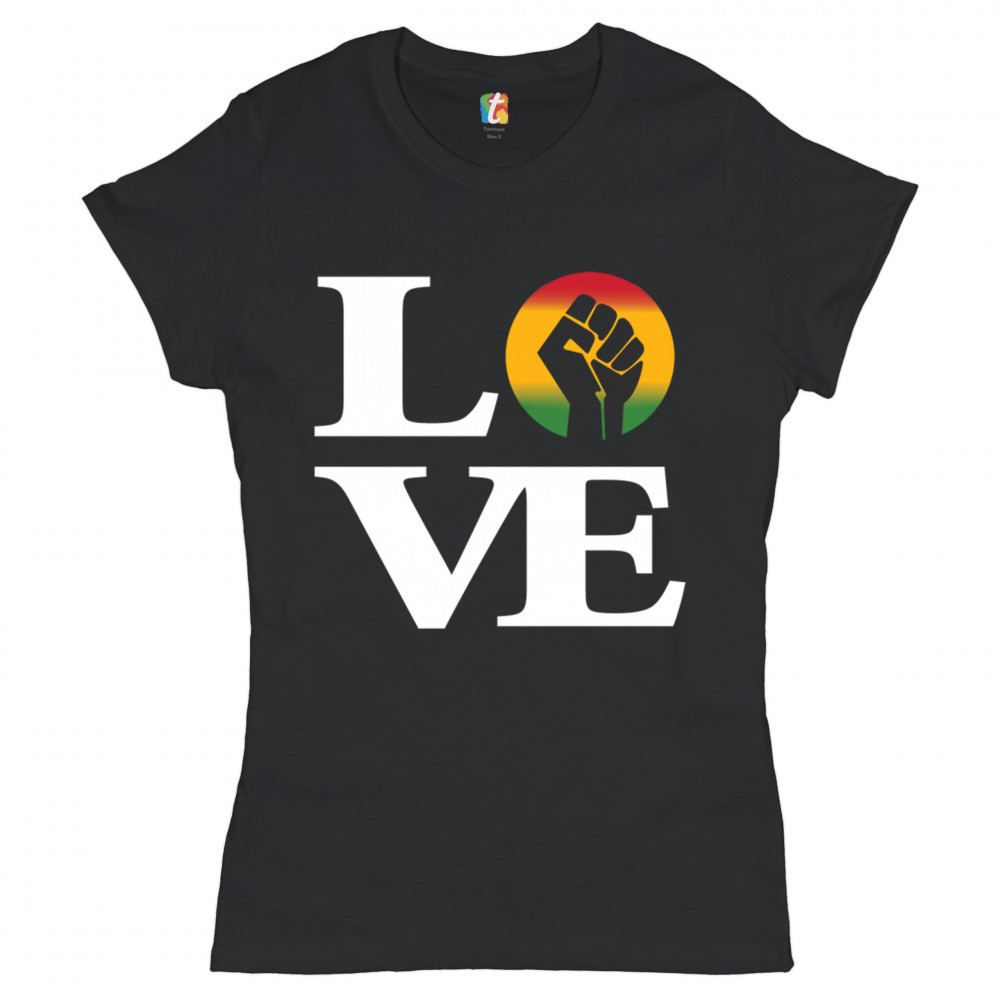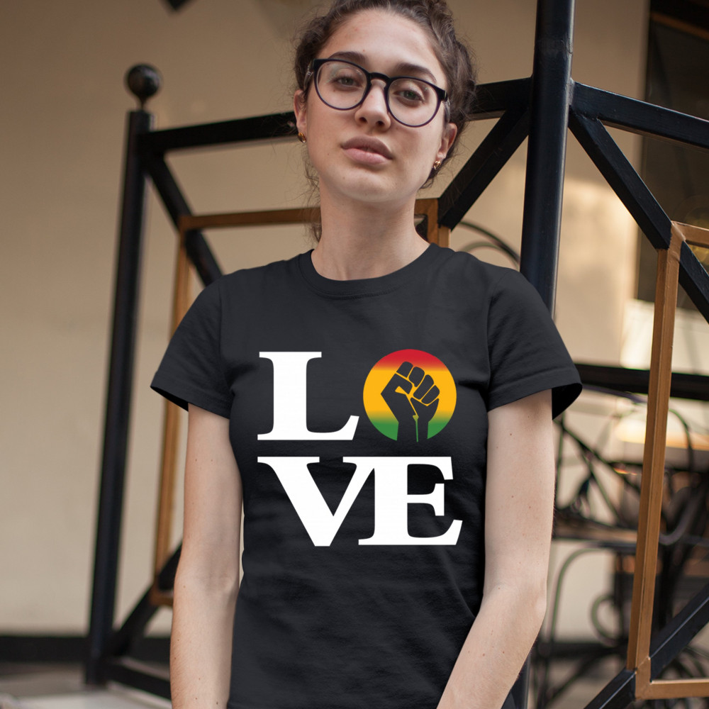 A political print depicting the word "Love" with a circle, painted in the Pan-African colors with a power fist inside of it, instead of the letter "o". Great choice to wear to spread an important message.