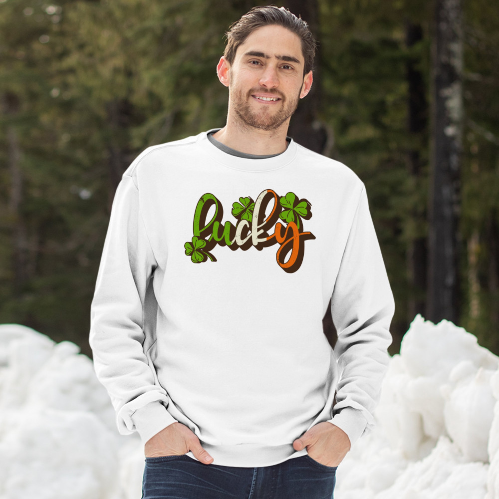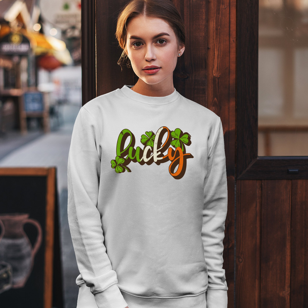 A print featuring the word "Lucky" with several shamrocks around it. A great choice to wear on March 17 to celebrate the St. Patrick's Day and showcase your Irish personlaity!
