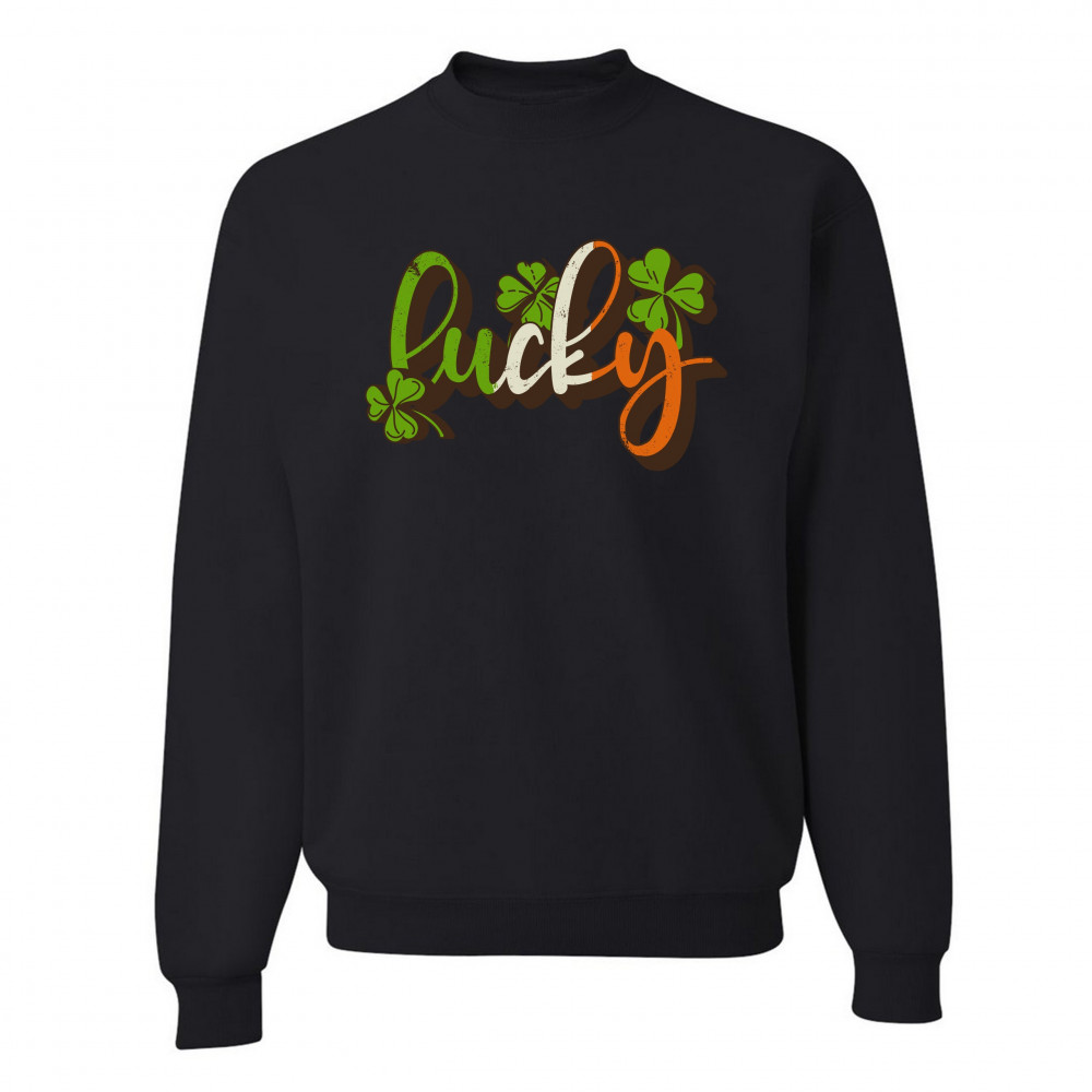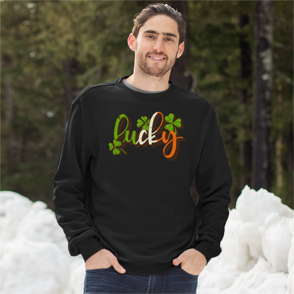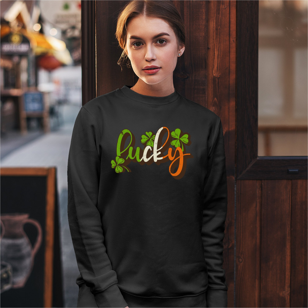A print featuring the word "Lucky" with several shamrocks around it. A great choice to wear on March 17 to celebrate the St. Patrick's Day and showcase your Irish personlaity!
