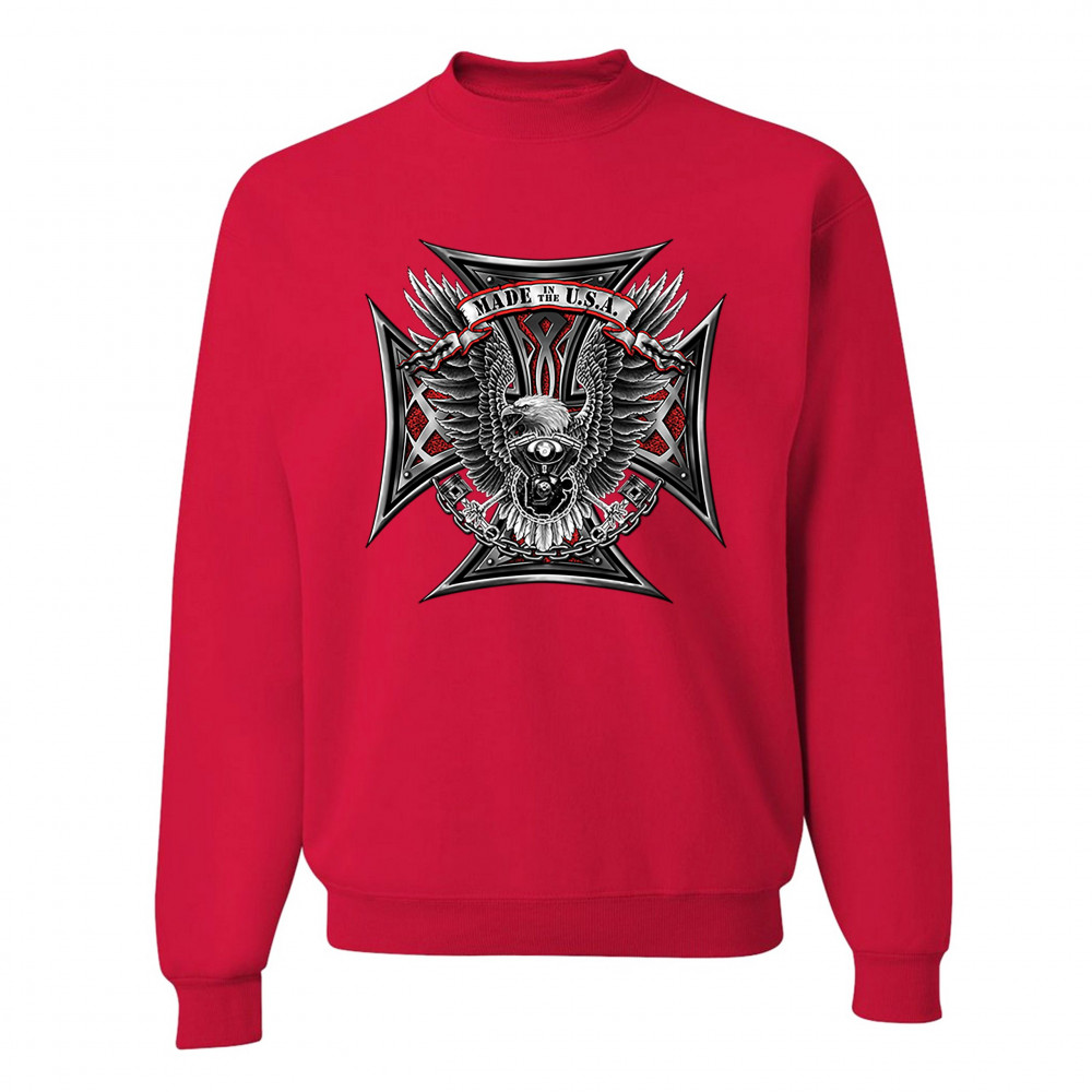 A print featuring a huge cross. In the front there is a bald eagle spreading it's wings and holding pistons in it's talons. In front of it's chest there is a V engine. At the top there is a stripe with "Made in the USA" written on it. A great choice for a