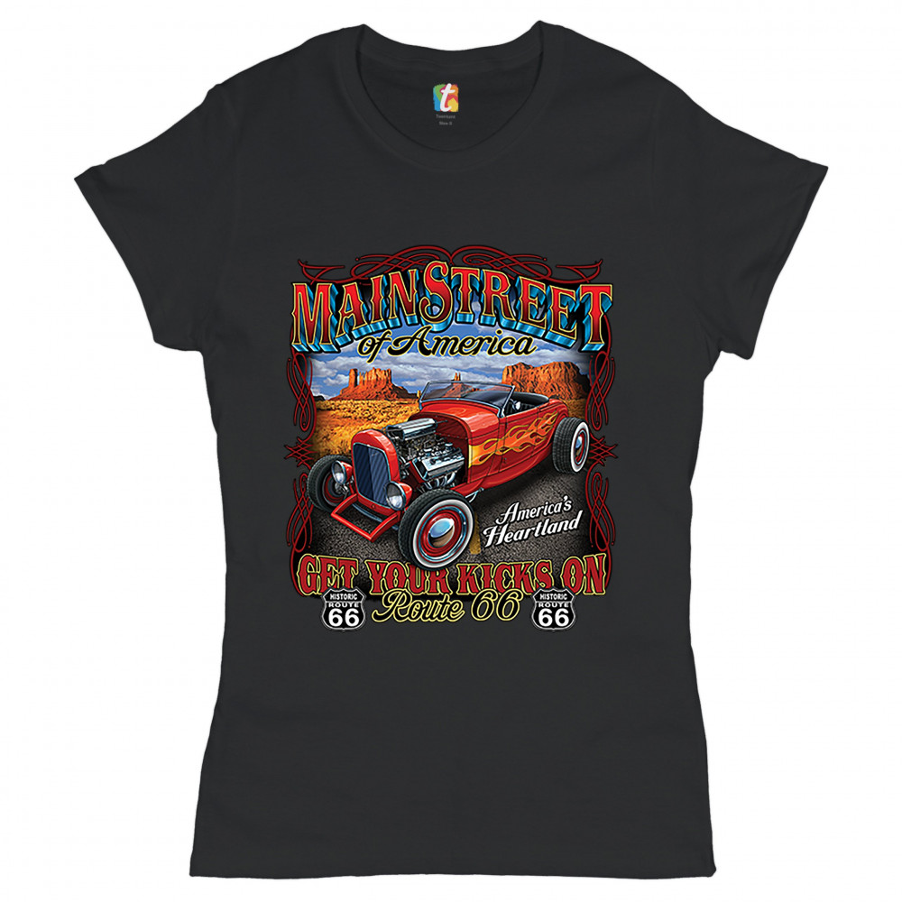 MAIN STREET OF AMERICA t-shirt america's heartland route 66 hot rod women's tee black