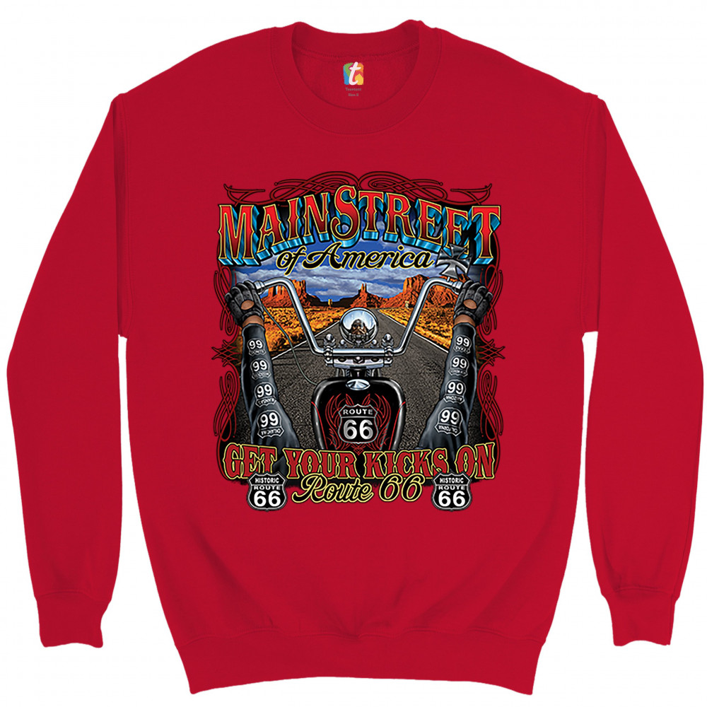 A print featuring a POV of a biker riding a chopper on a Route 66. There are are numerous "Route 66" and "Historic Route 66" signs all over the print and the print says: "Main street of America" and "Gwt your kicks on Route 66". A great choice for a motor