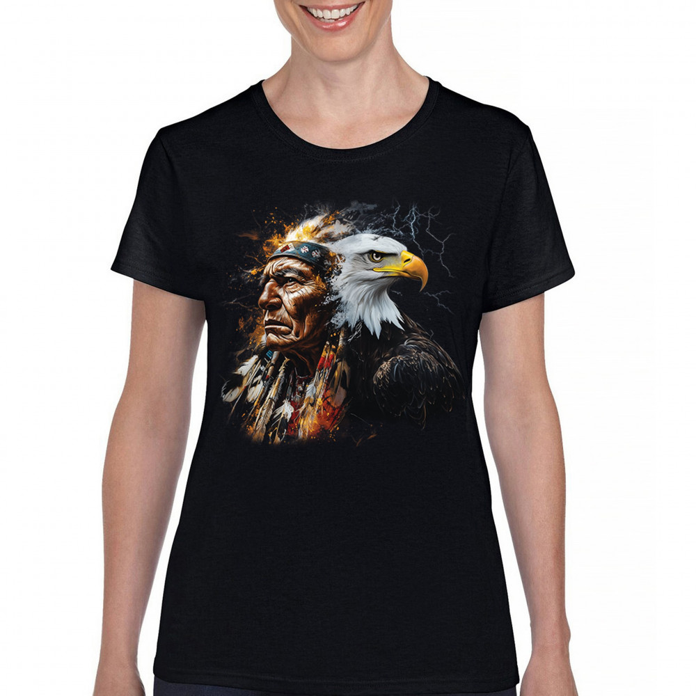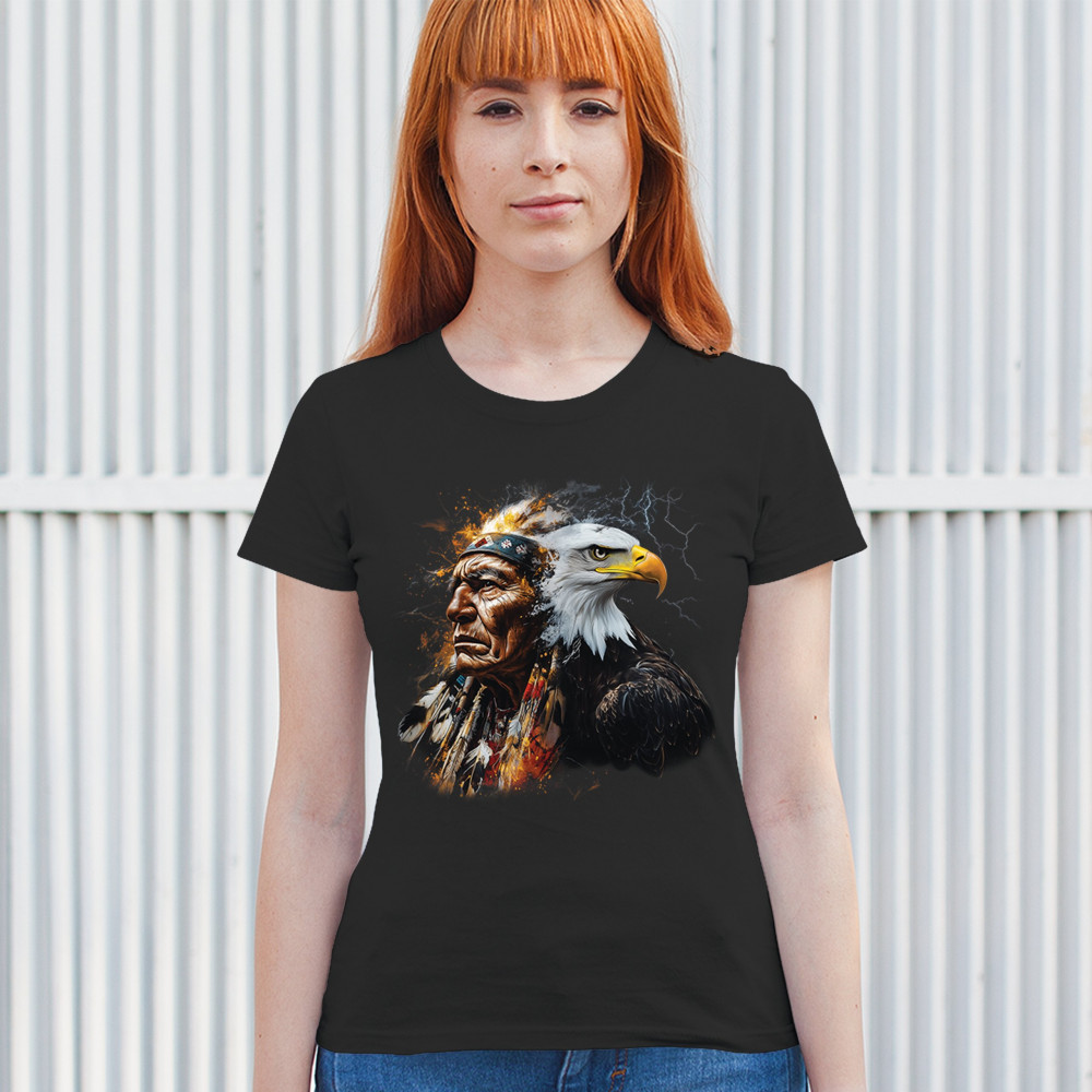 This electrifying design showcases a Native American chief with a bold bald eagle, surrounded by lightning and fire. It blends spiritual animal symbolism with cultural strength and pride. Ideal for admirers of tribal heritage, ancestral energy, and fierce visual storytelling through nature and tradition.