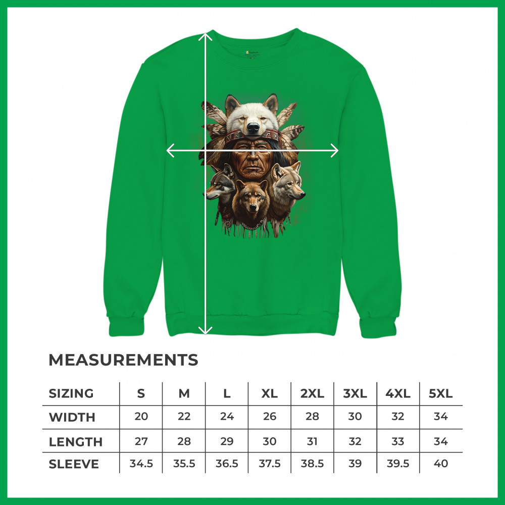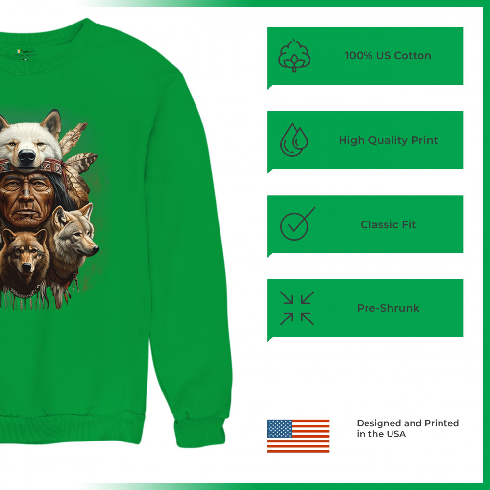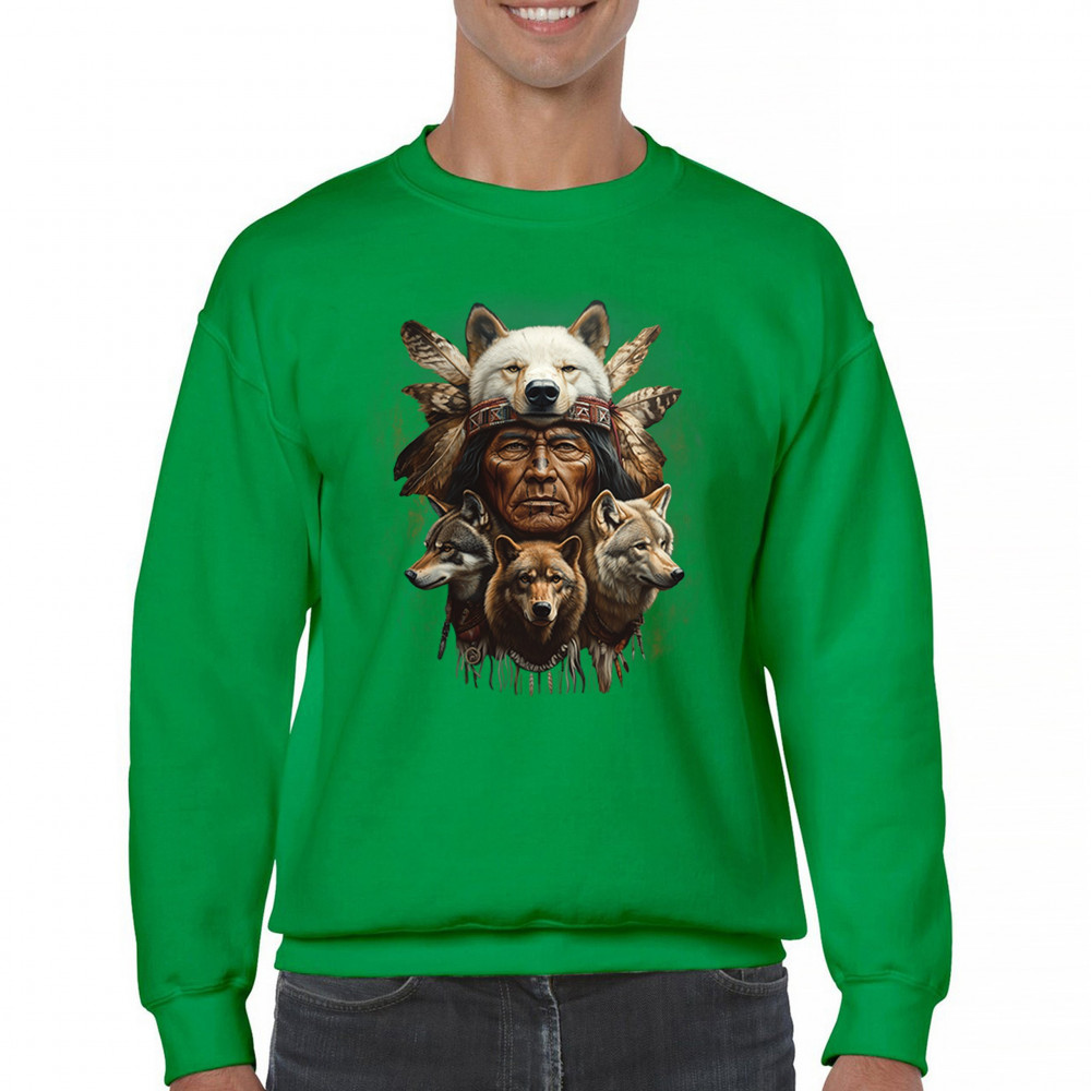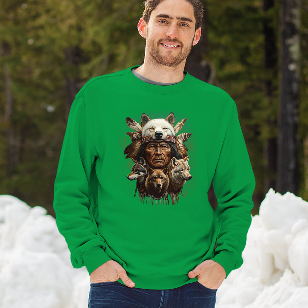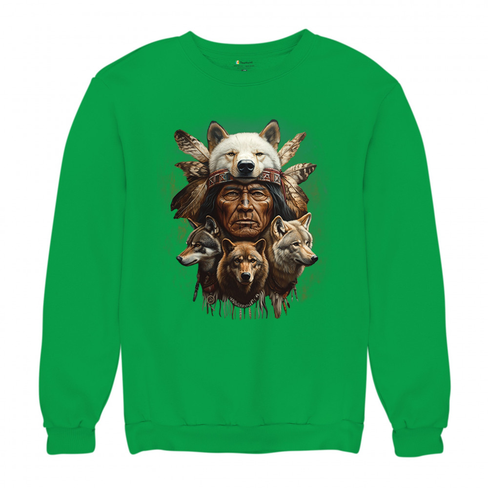 Wolf totem design with Native elder in headdress and guardian wolves. Symbolizes strength, loyalty, spirit animals, and tribal heritage.