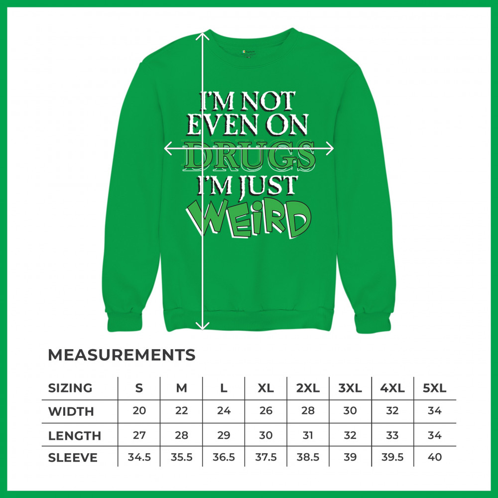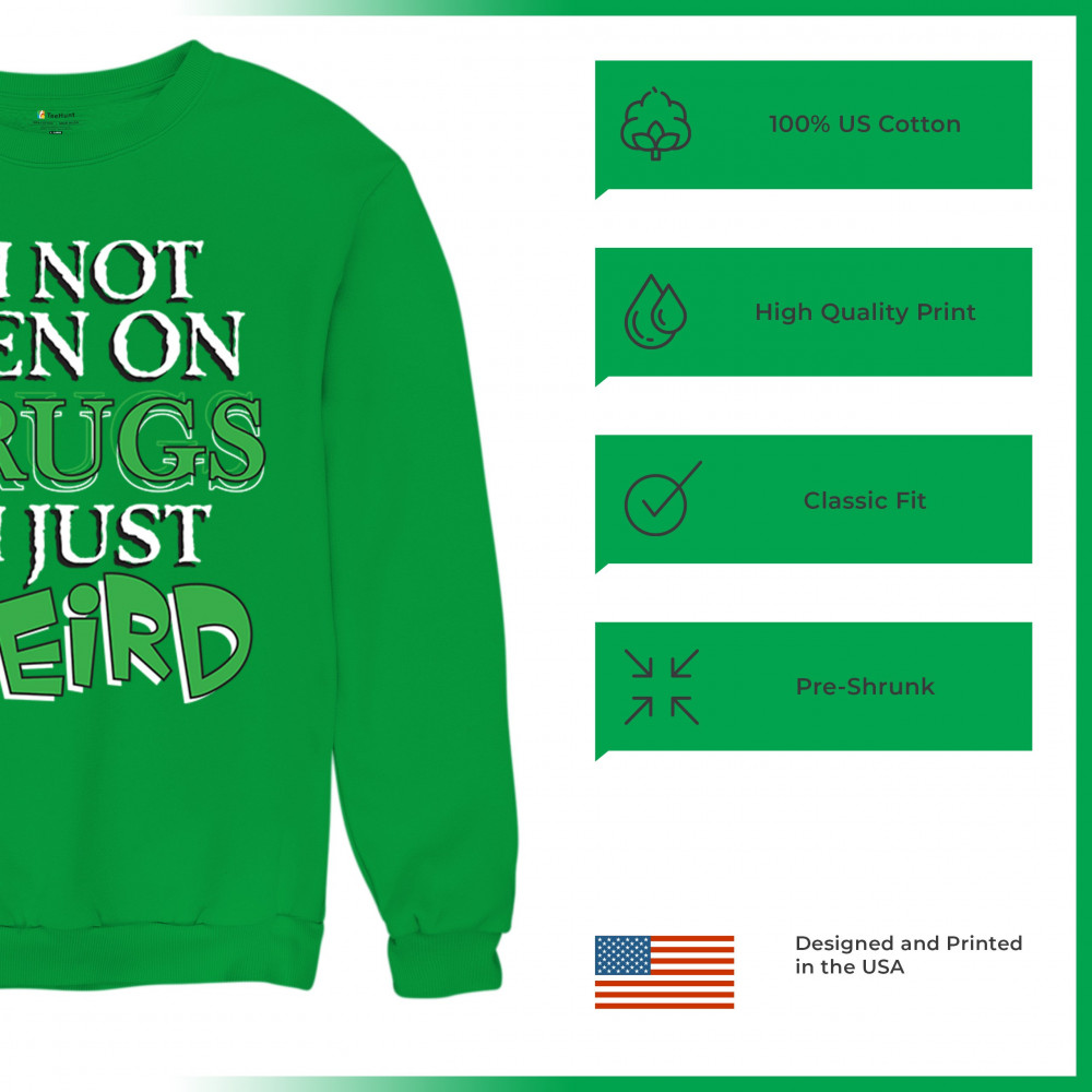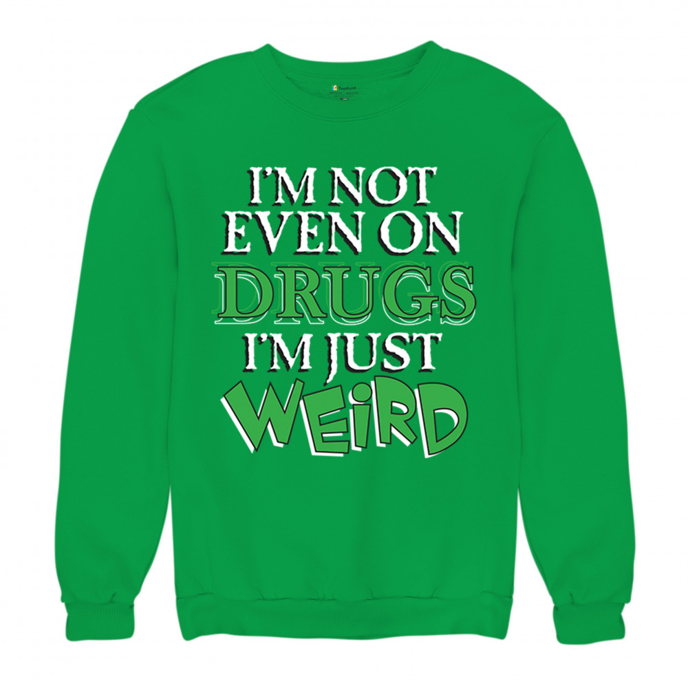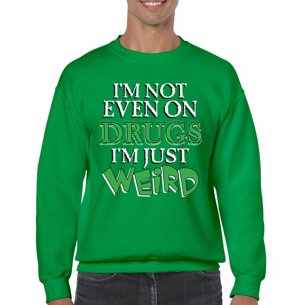 NOT EVEN ON DRUGS WEIRD sweatshirt funny antidrug humor sarcastic weed crewneck green
