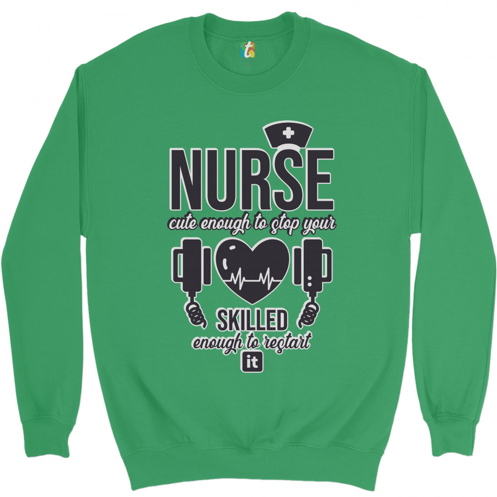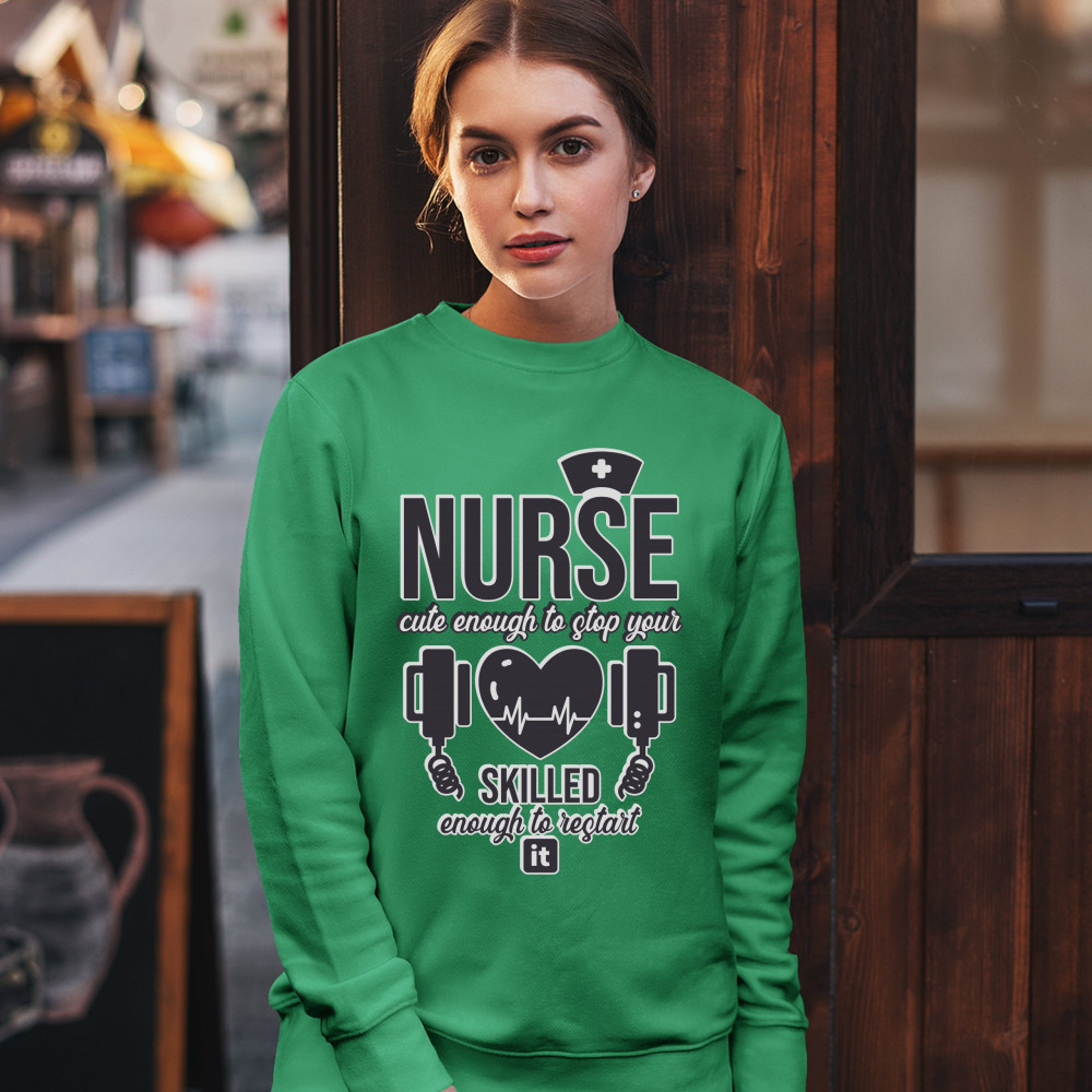 A print saying: "Nurse - Cute Enough to Stop Your Heart, Skilled Enough to Restart It". In the center of the print there is a a heart with two defibrilators to it's sides. A great choice as a gift for a registered nurse, who is busy everyday saving people