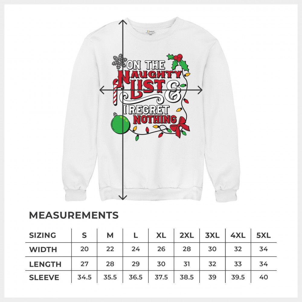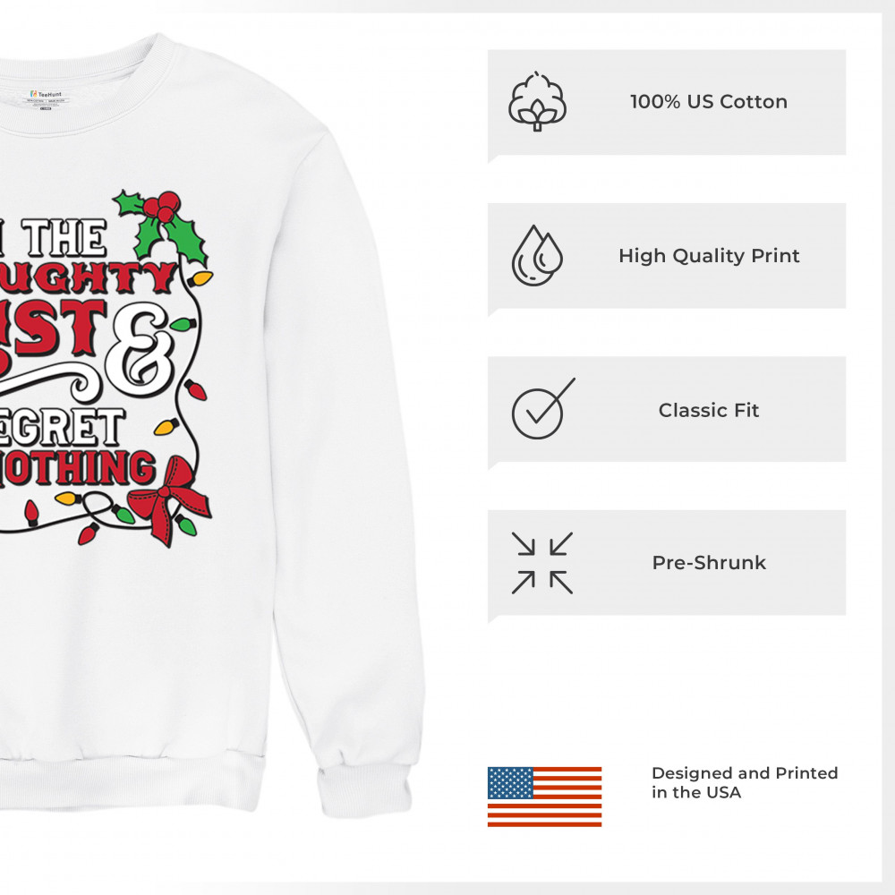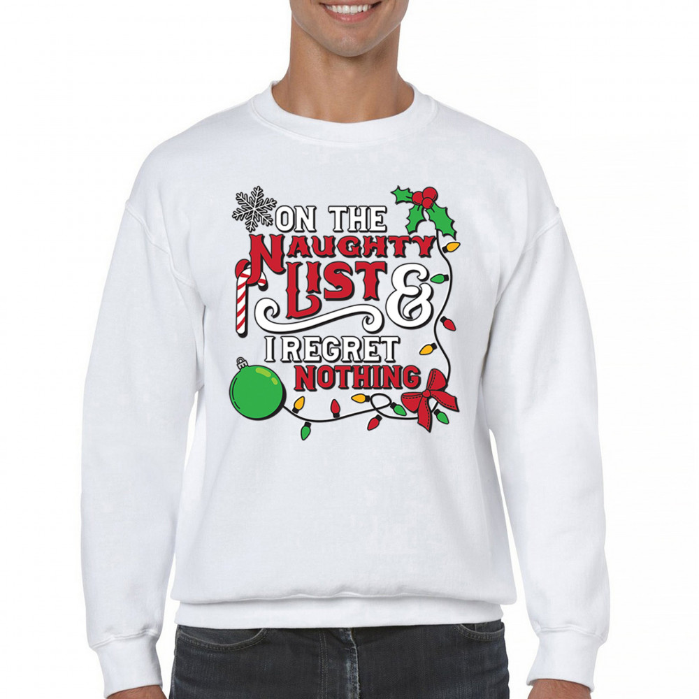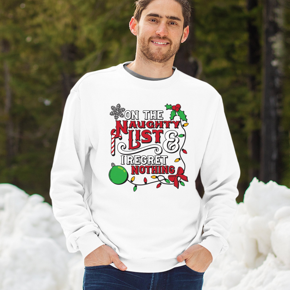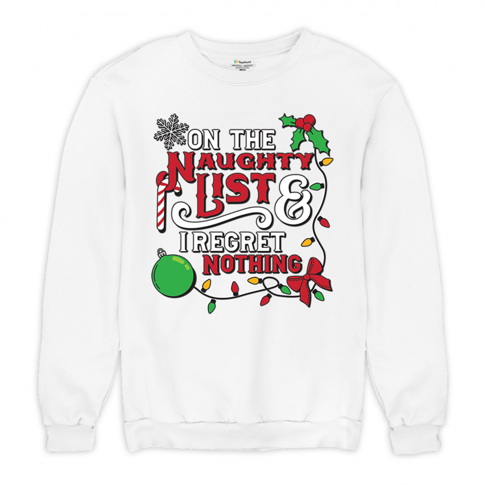 Celebrate the holidays with the playful “Naughty List & I Regret Nothing†design. Perfect for festive gatherings, ugly sweater parties, and holiday fun!