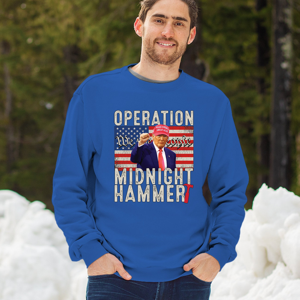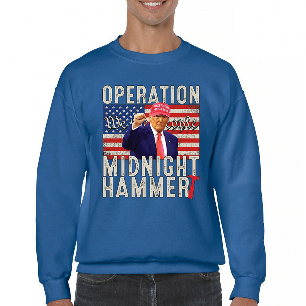 Operation Midnight Hammer is a bold, pro-America design featuring a presidential figure, hammer symbolism, and USA flag. For those who believe in America First, military strength, and Republican values. Worn by patriots who stand for freedom, leadership, and unwavering national pride.