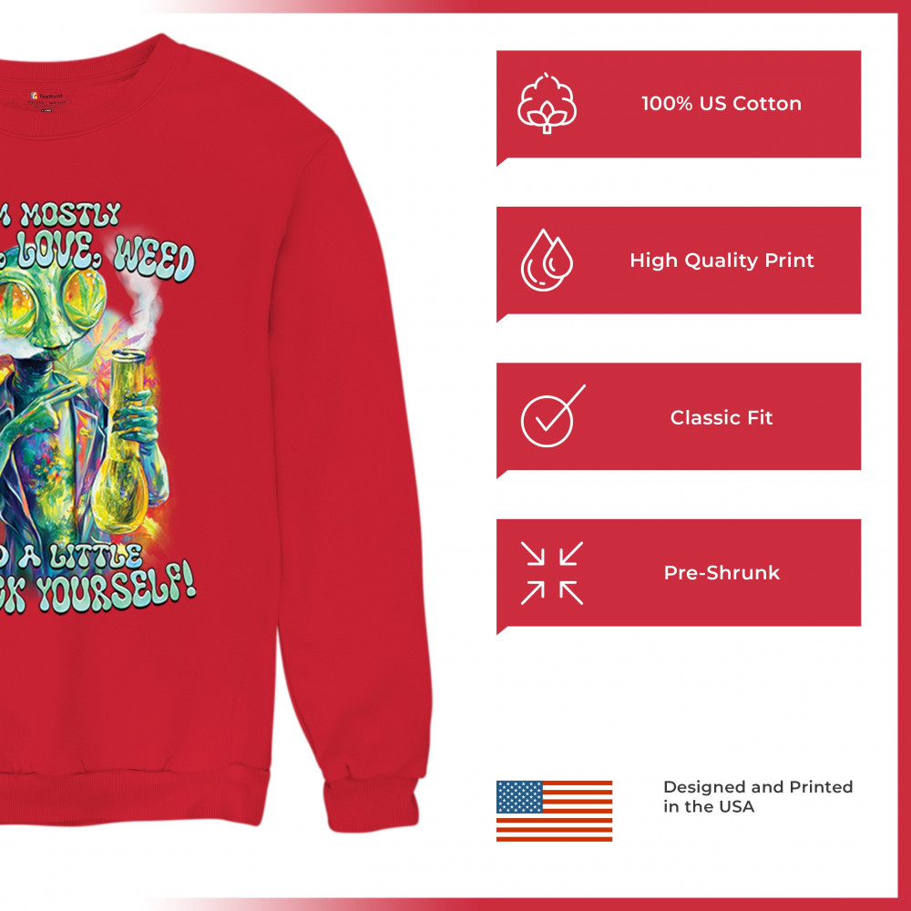 This bold alien stoner design fuses colorful weed art with raw honesty and stoner attitude. Featuring a high alien and vibrant peace love weed vibe, it's perfect for unapologetic smokers who blend kindness and truth. Wear it at festivals, smoke sessions, or whenever your mood is 80% peace, 20% sarcasm. It’s humor, cannabis culture, and bold energy rolled into one.