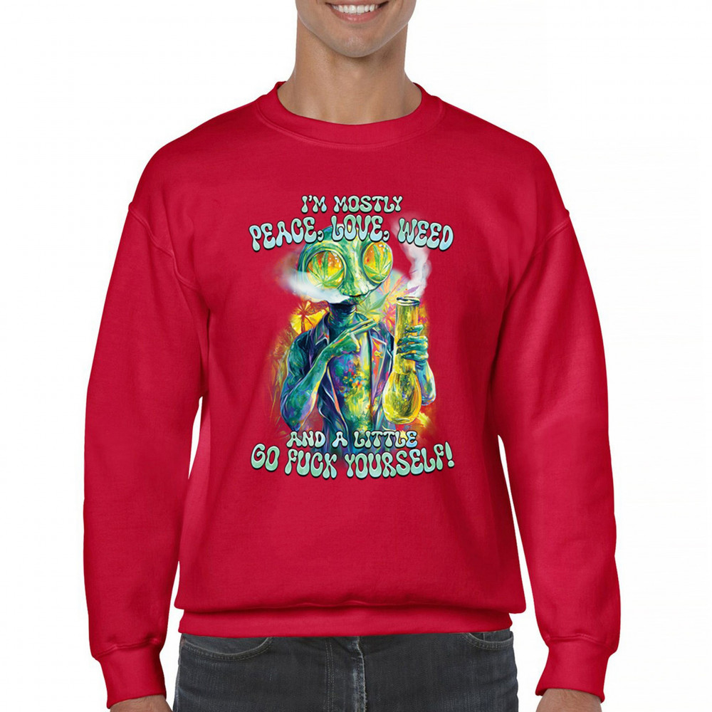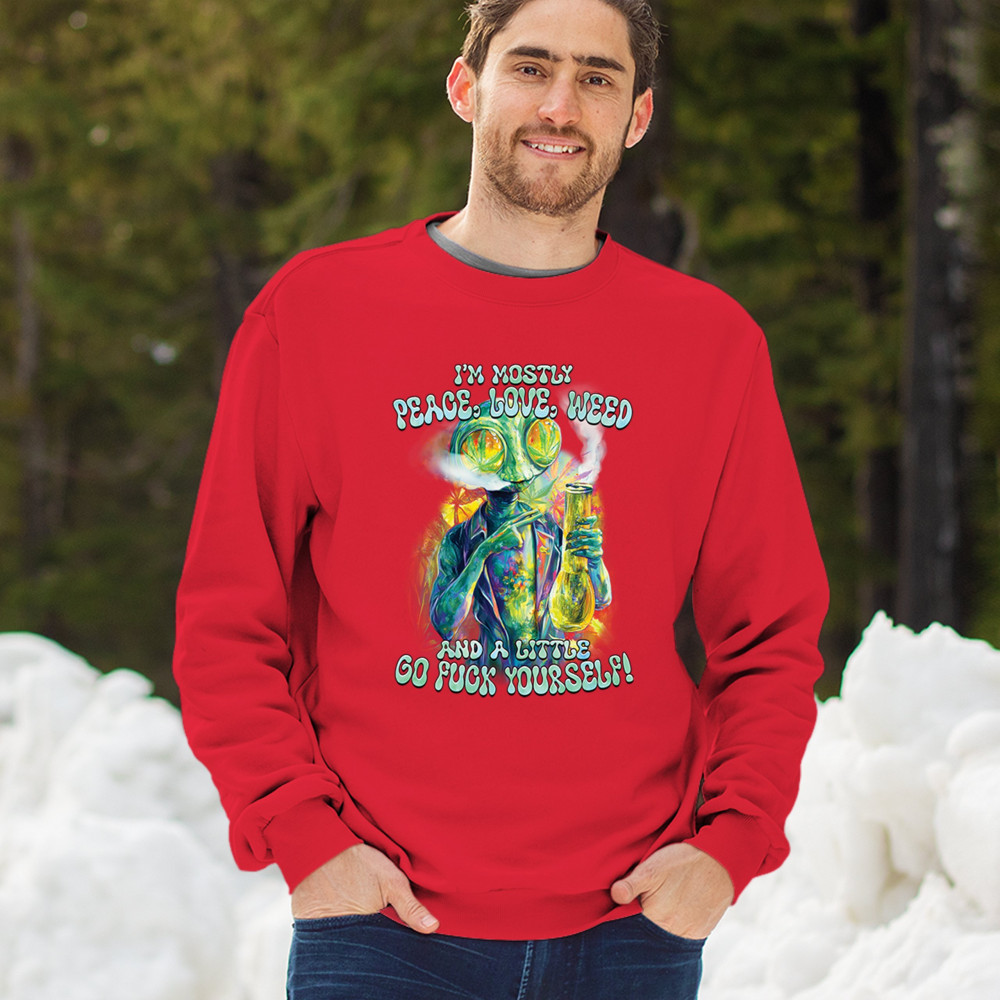Bold alien cannabis design mixing humor, sarcasm, and weed culture—perfect for unapologetic smokers with attitude and peace vibes.