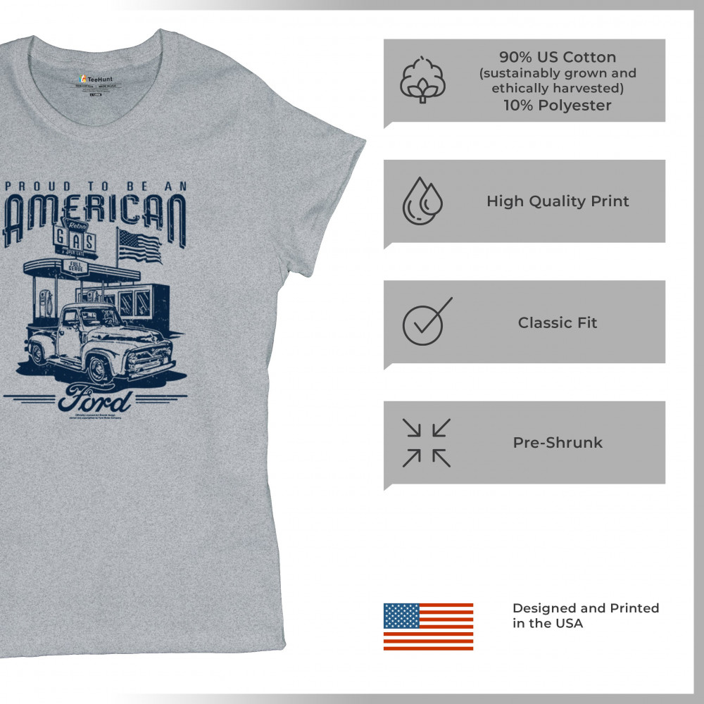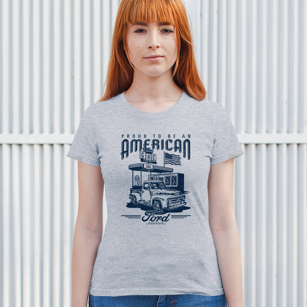 PROUD TO BE AN AMERICAN FORD t-shirt 1950s vintage truck licensed women's tee gray