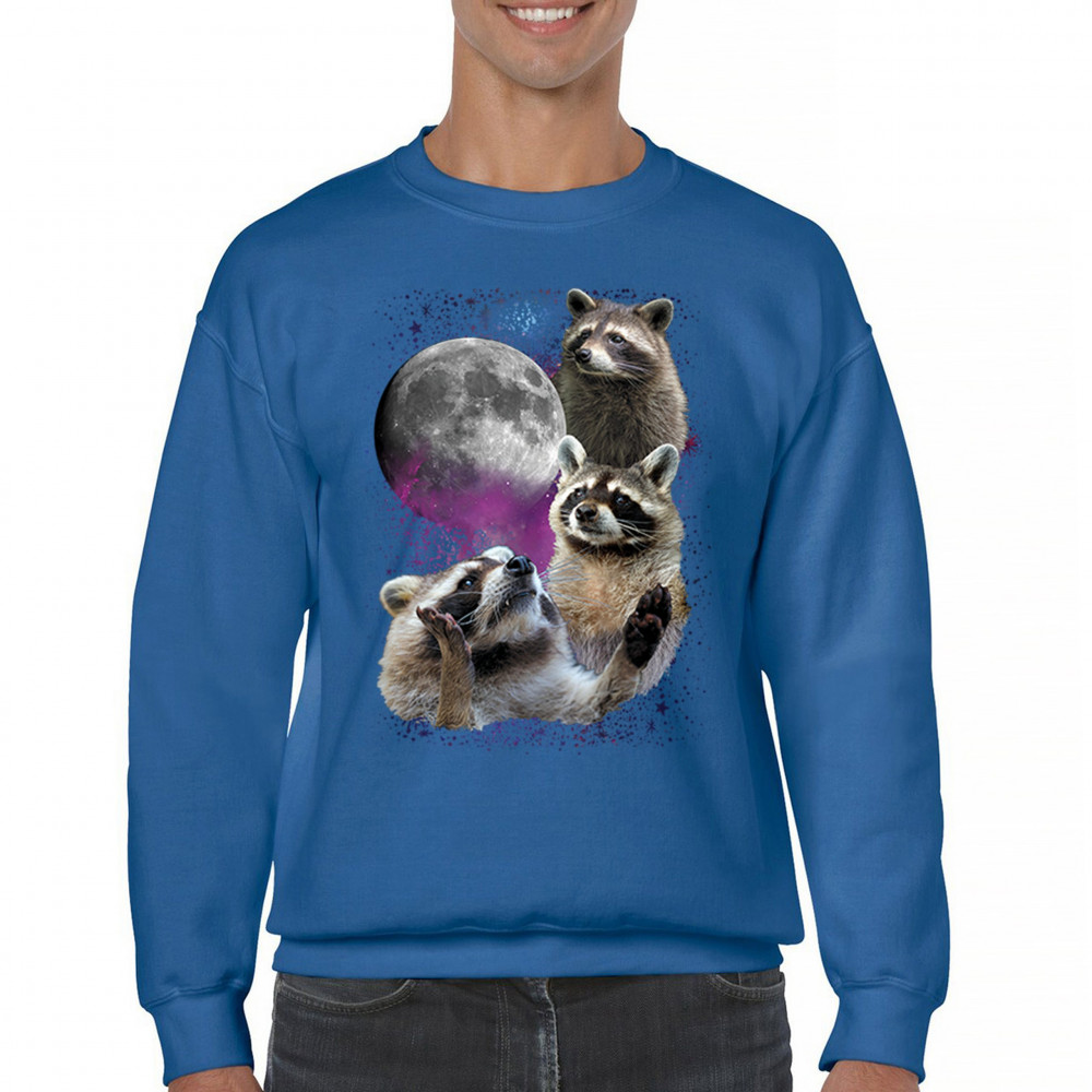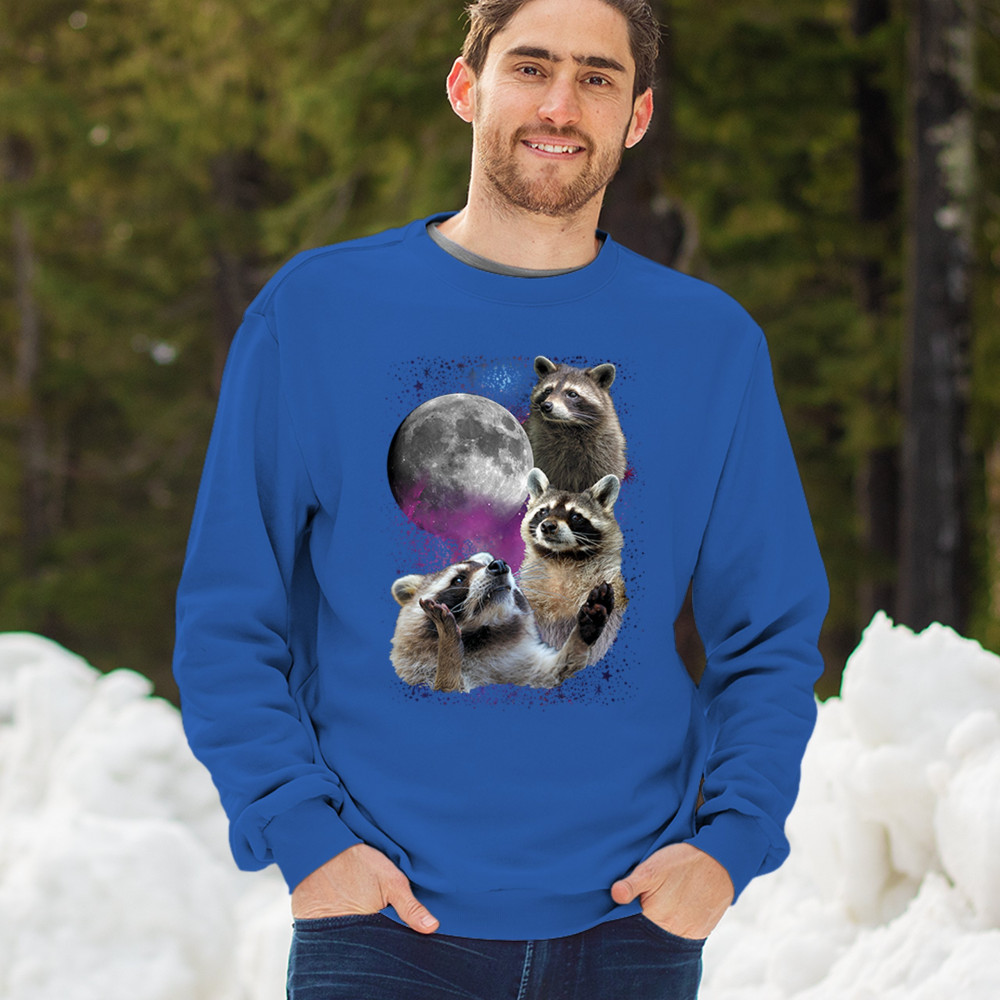 Embrace nature with this quirky raccoon and moon design, perfect for space and animal lovers. Ideal for casual wear or gifts.
