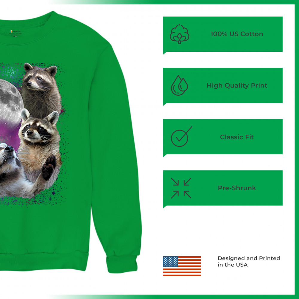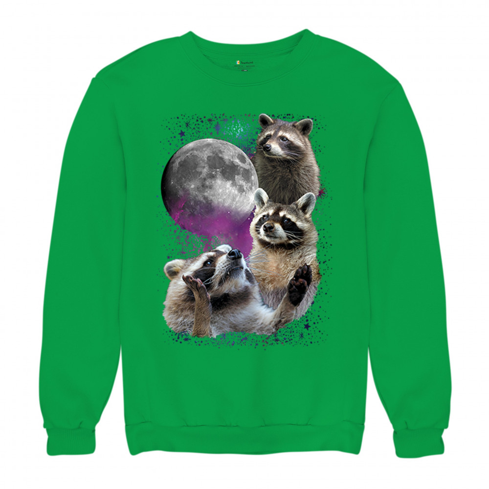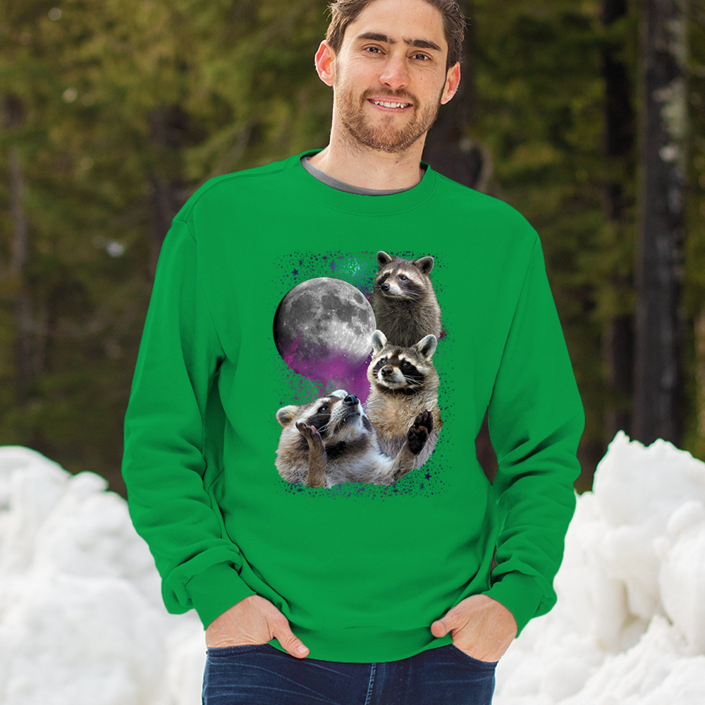 Embrace nature with this quirky raccoon and moon design, perfect for space and animal lovers. Ideal for casual wear or gifts.