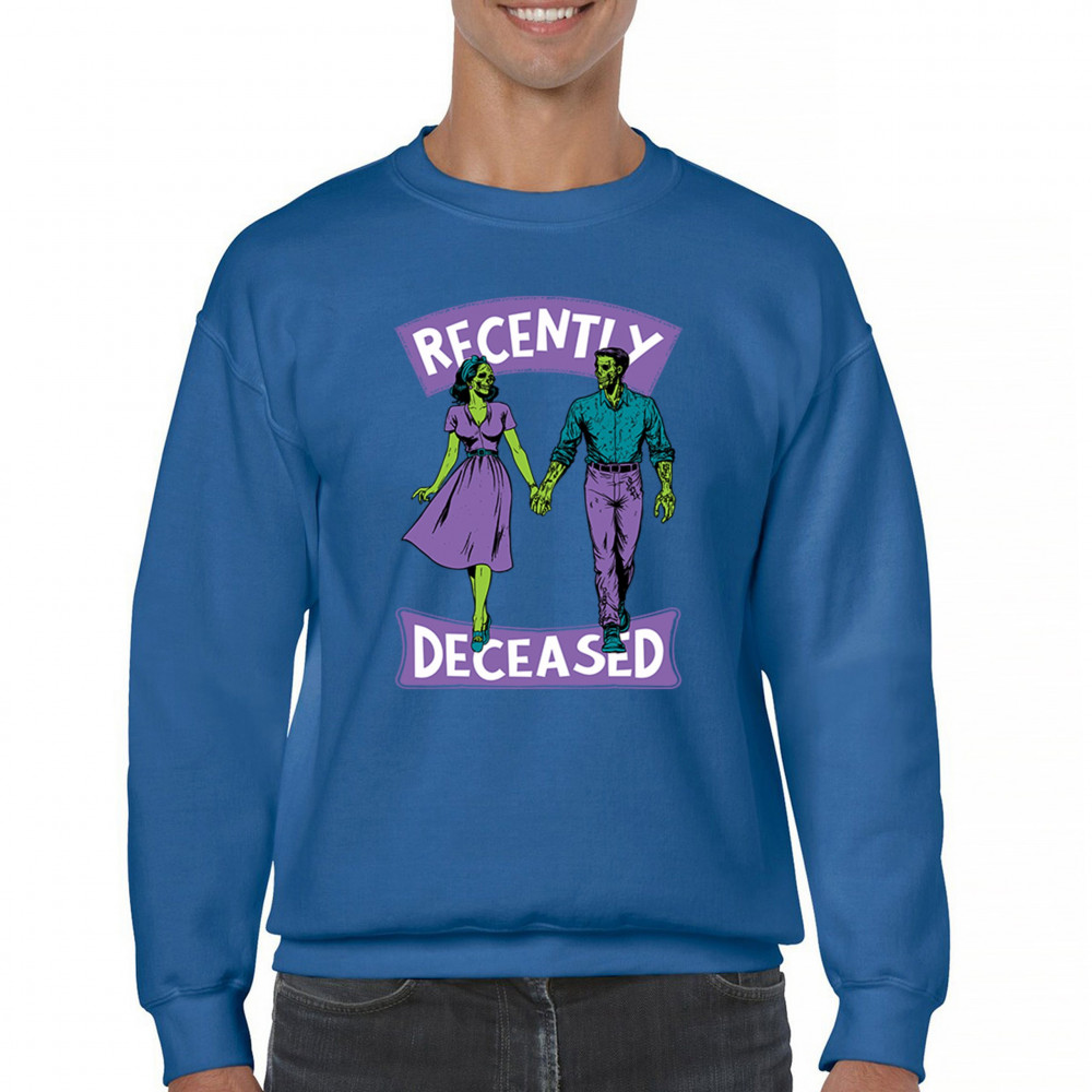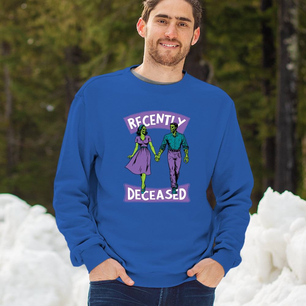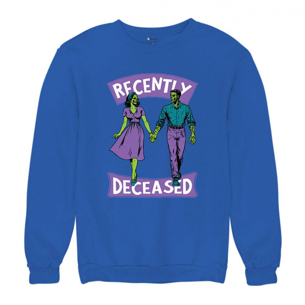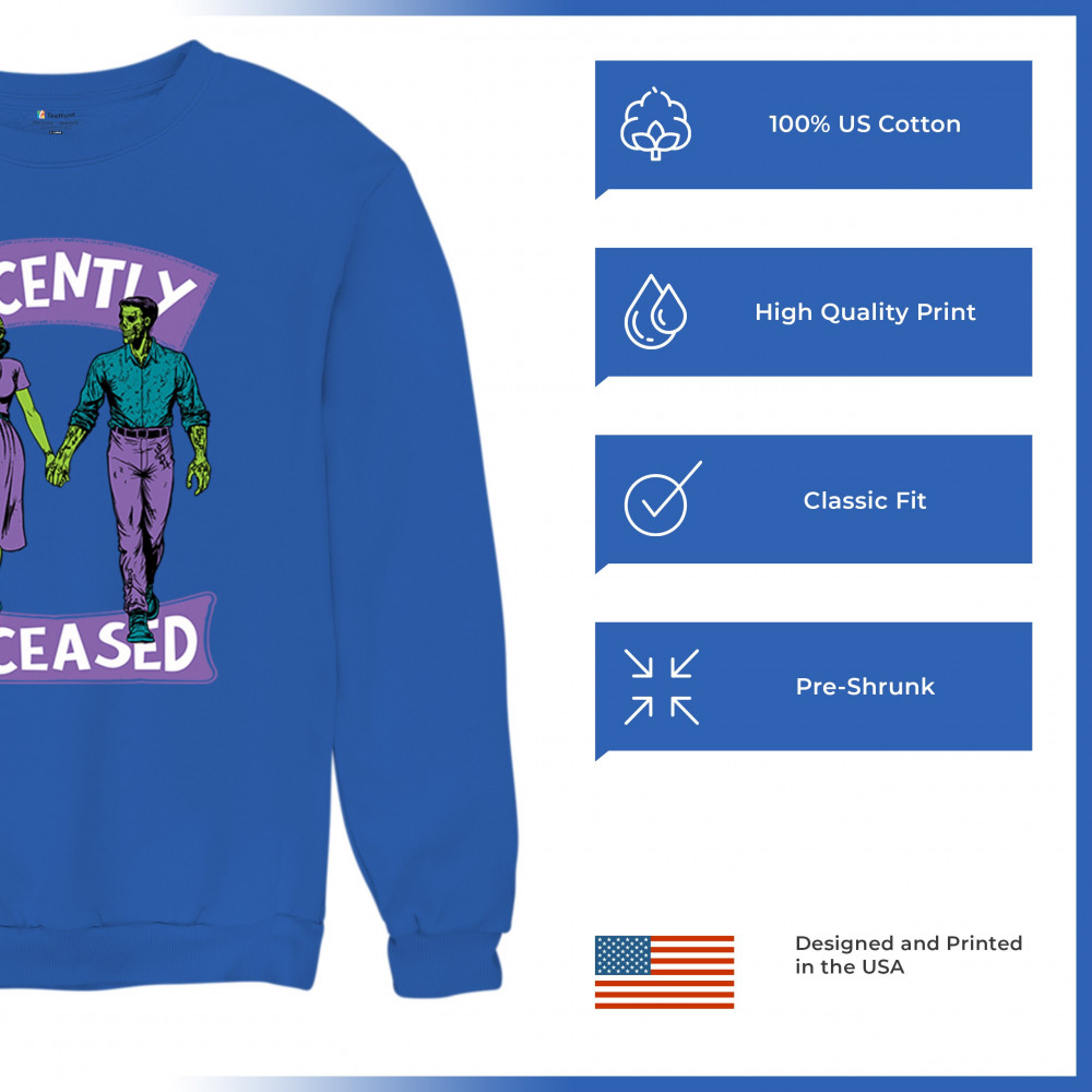 Recently Deceased zombie couple shirt with undead lovers design, spooky season humor, Halloween zombie outfit, and haunted house vibes.