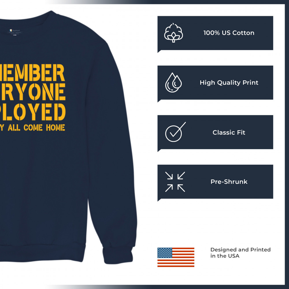 Show your support for deployed troops with our "Remember Everyone Deployed" shirt. Perfect for patriotic events like Veterans Day and Memorial Day.