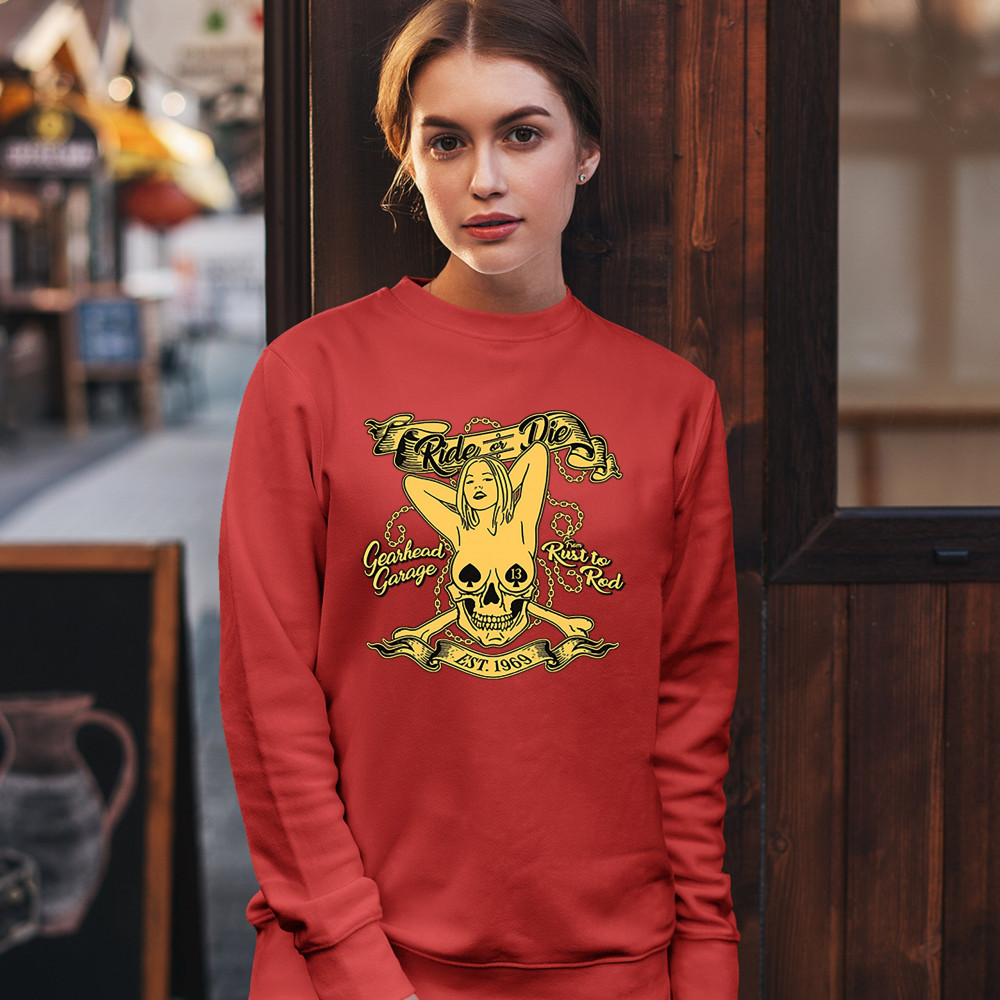 RIDE OR DIE sweatshirt gearhead garage from rust to rod biker babe crewneck red