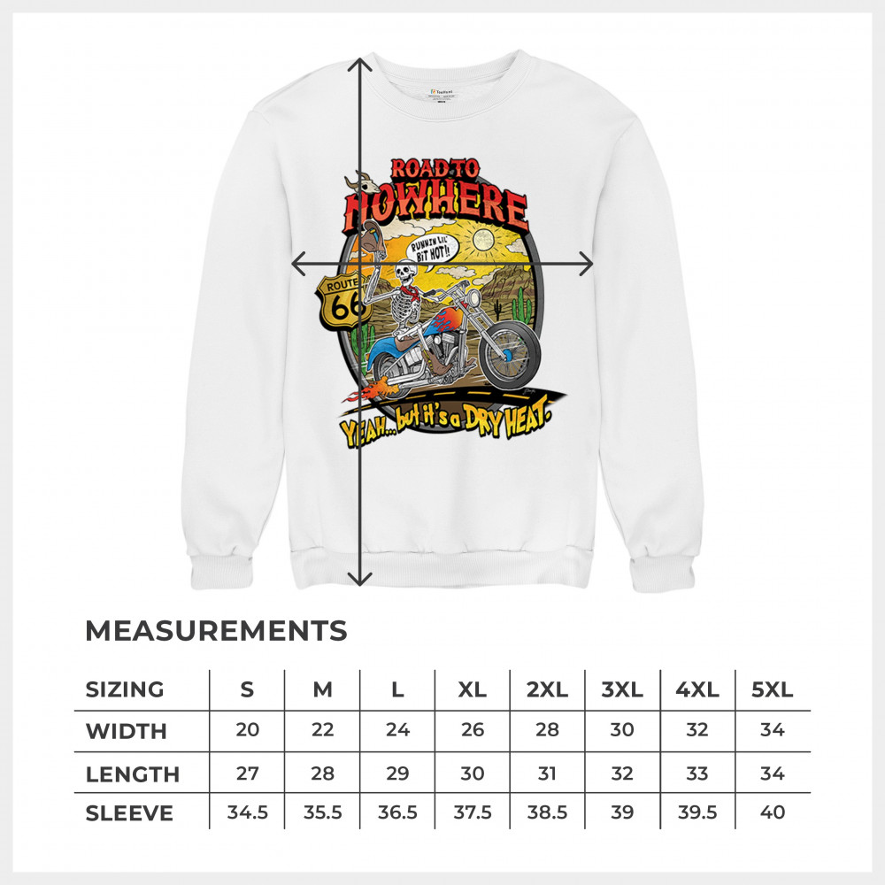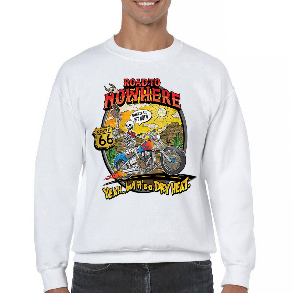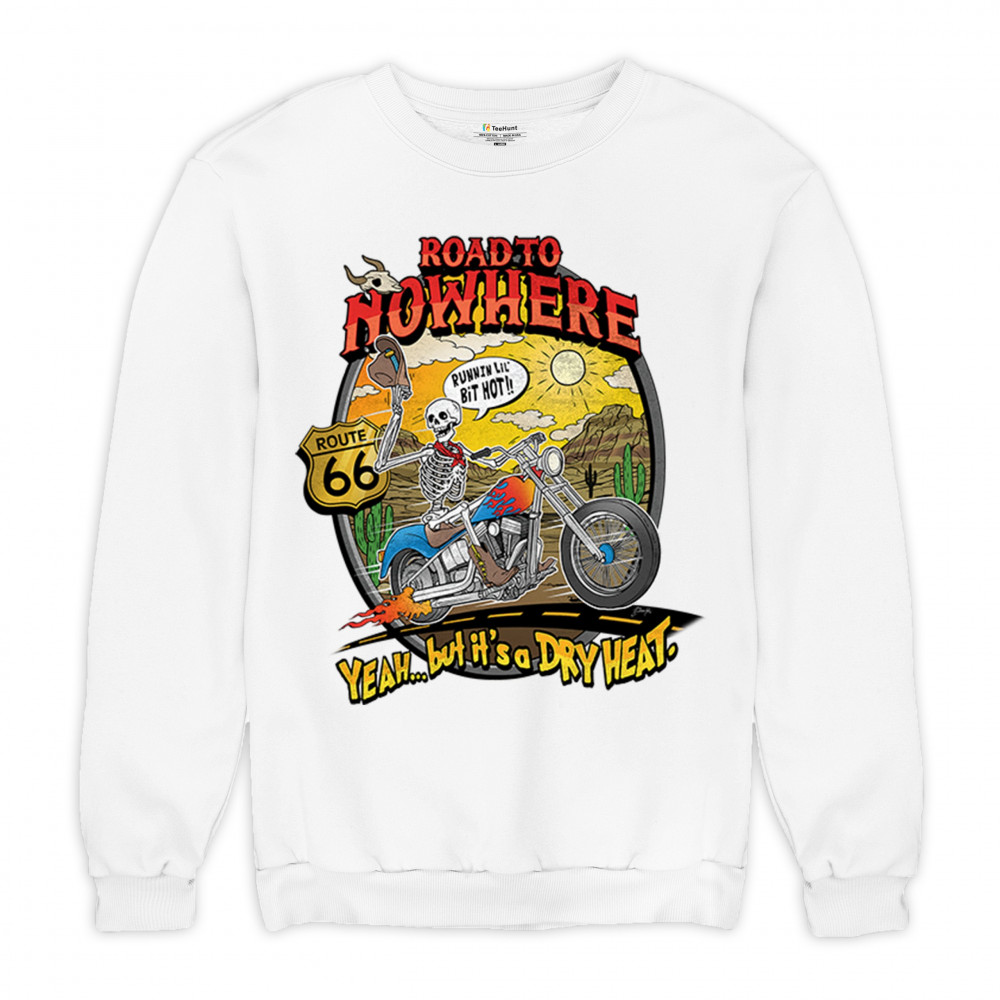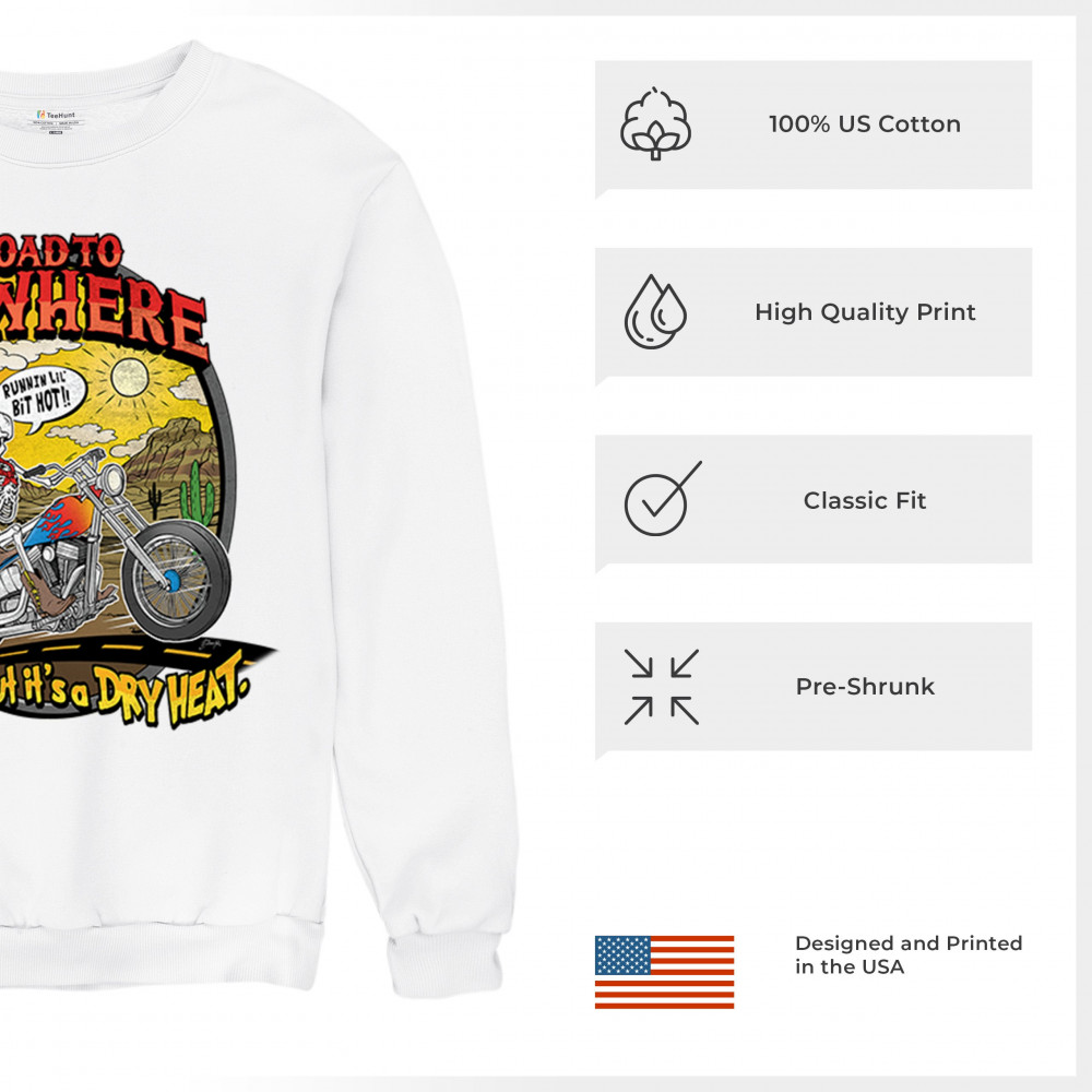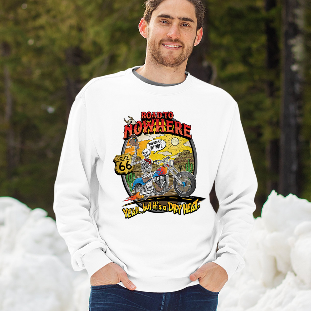 ROAD TO NOWHERE sweatshirt but its a dry heat funny biker motorcycle crewneck white
