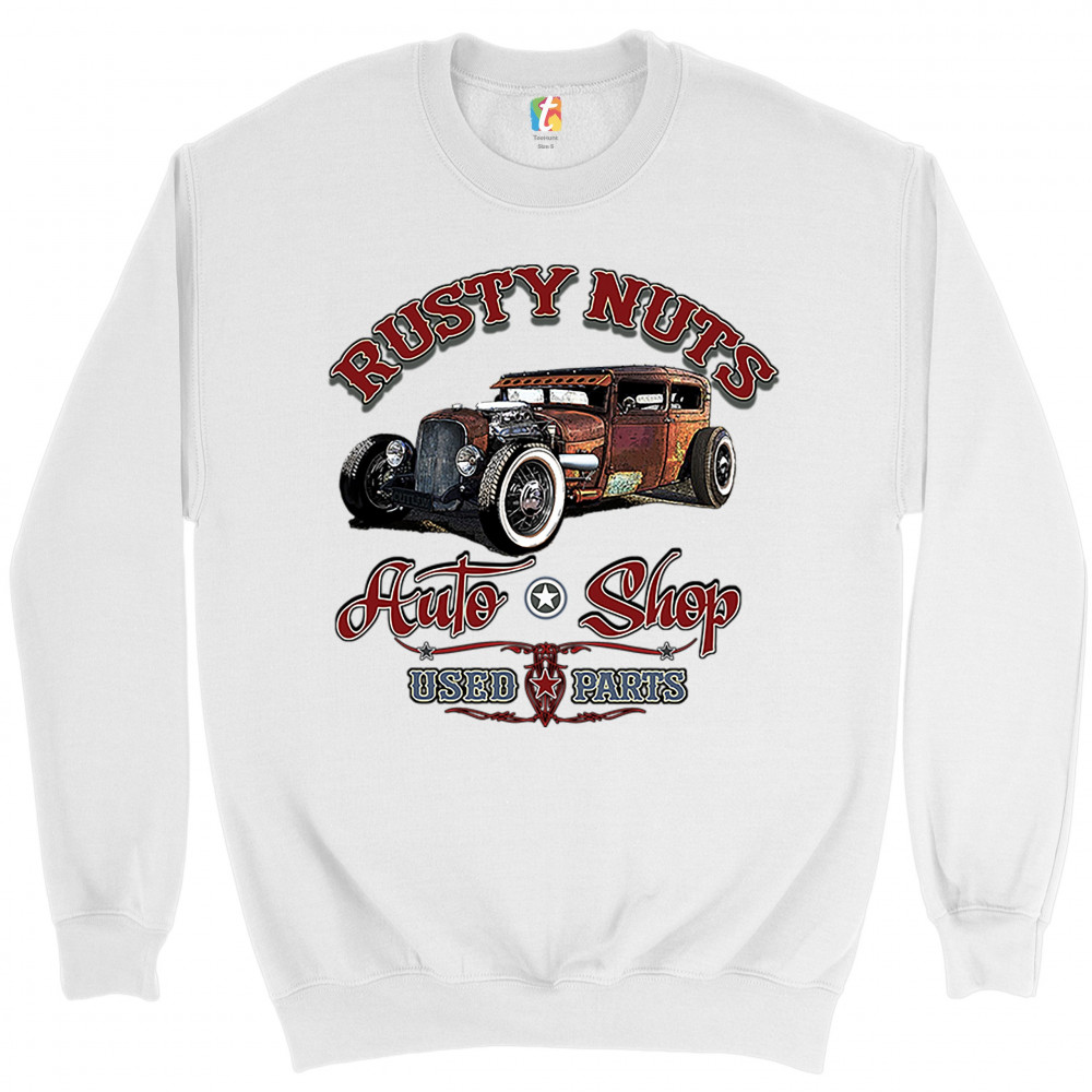 RUSTY NUTS AUTO SHOP sweatshirt hot rod rat rod vintage old school crewneck white
