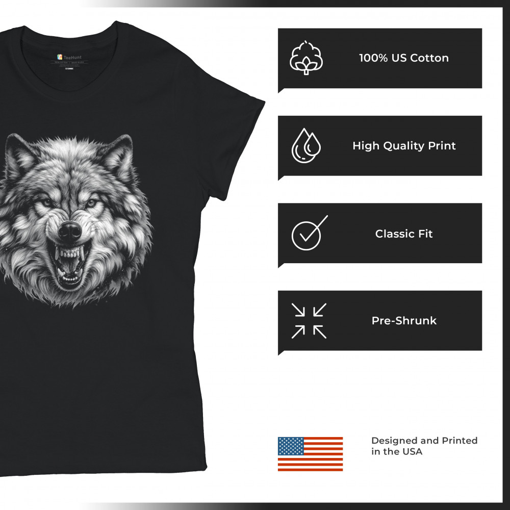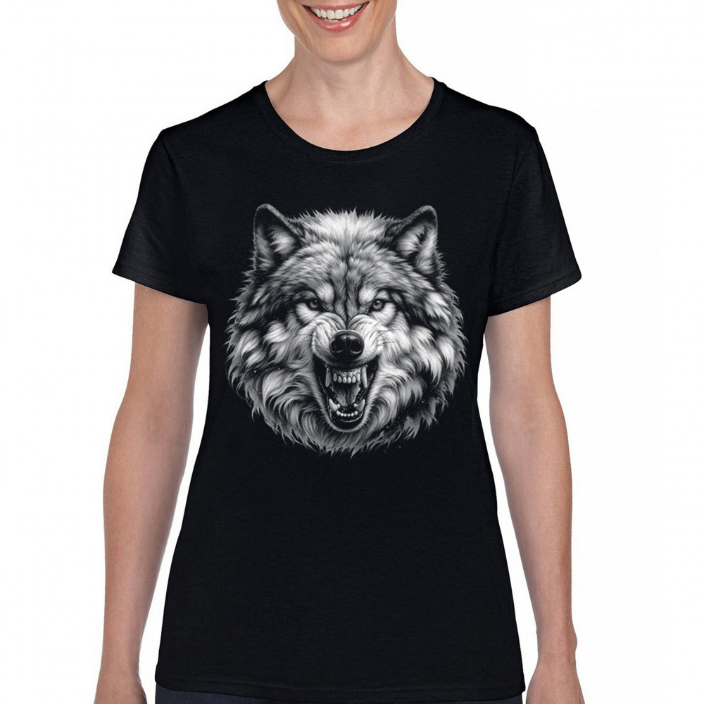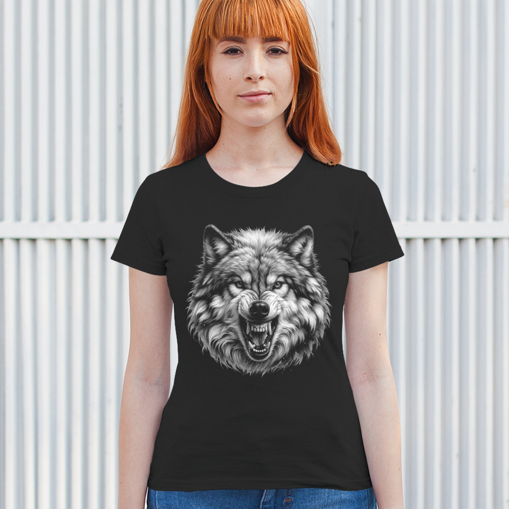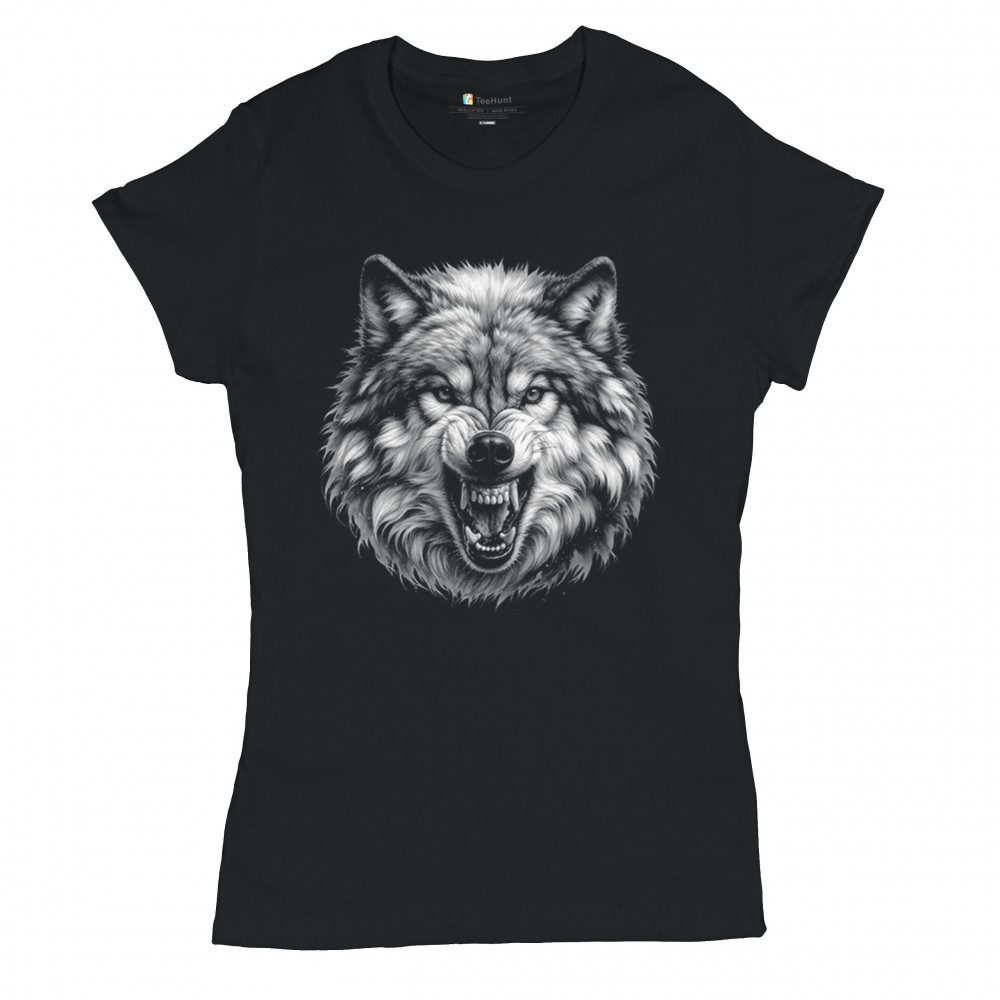 SNARLING WOLF PORTRAIT t-shirt fierce monochrome wild animal nature women's tee black
