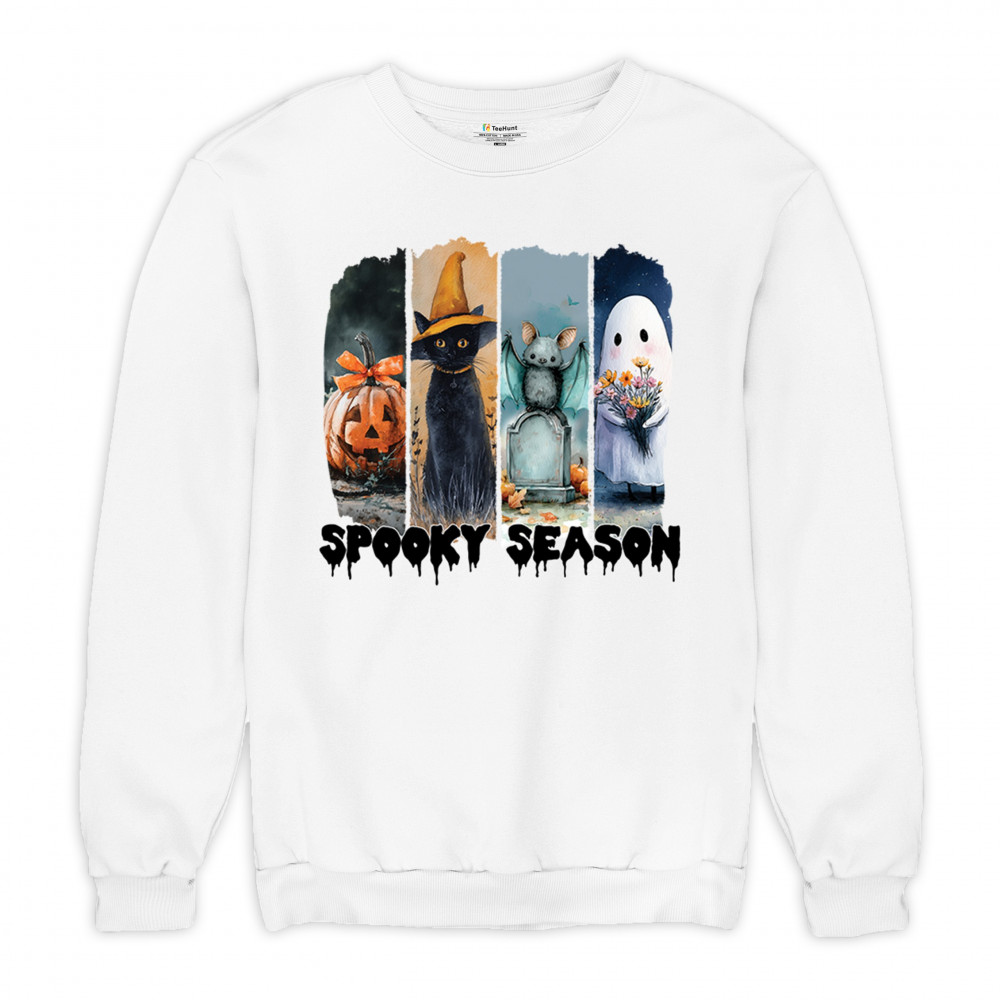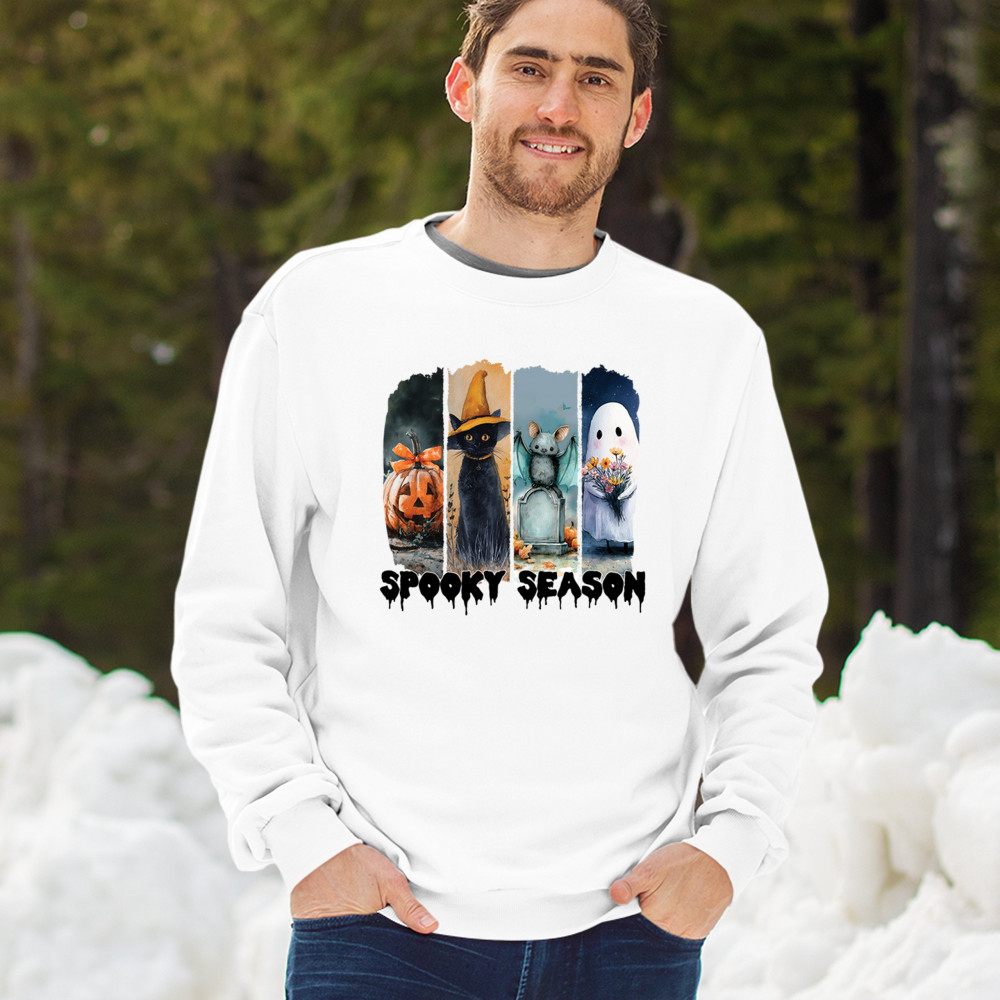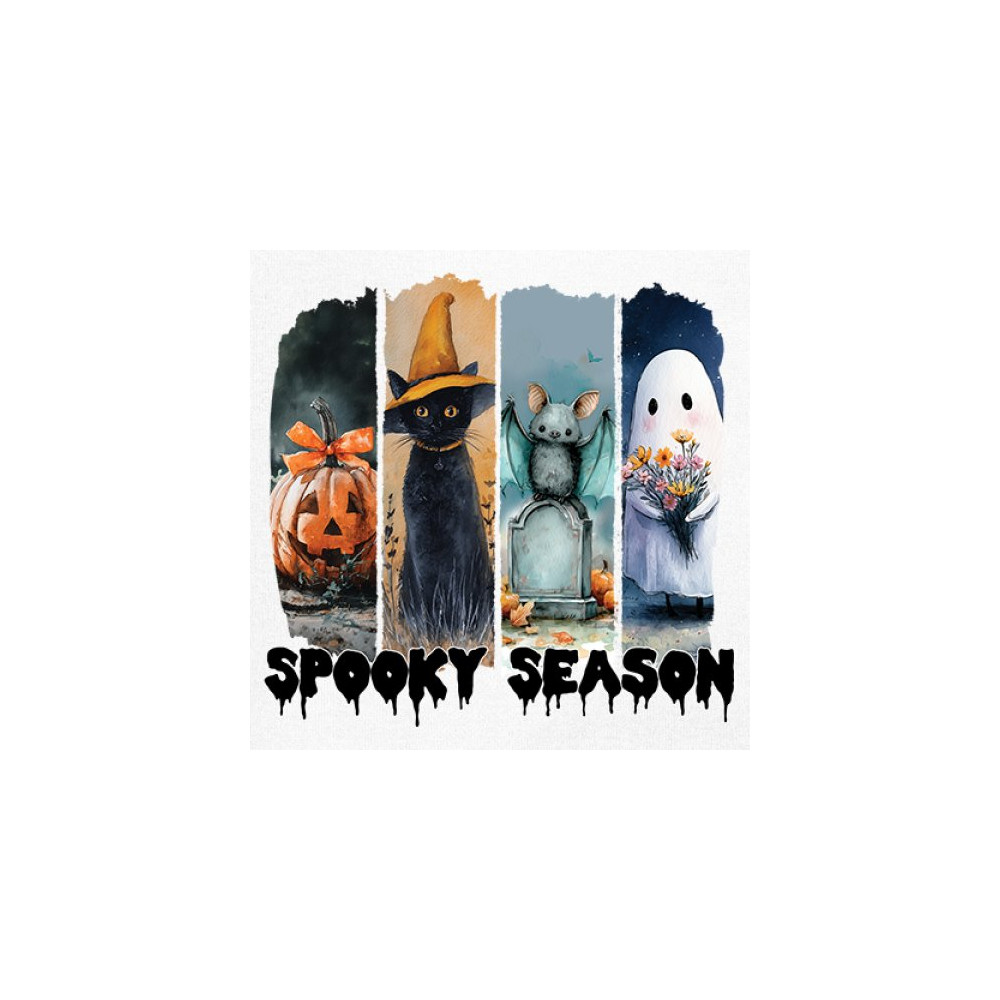 Spooky Season design with scary black cat, jack o lantern, haunted ghost house, and cute ghost. Perfect for October 31, trick or treat, and fall fun.
