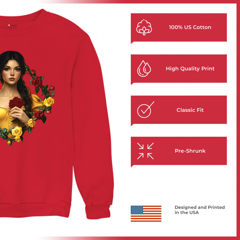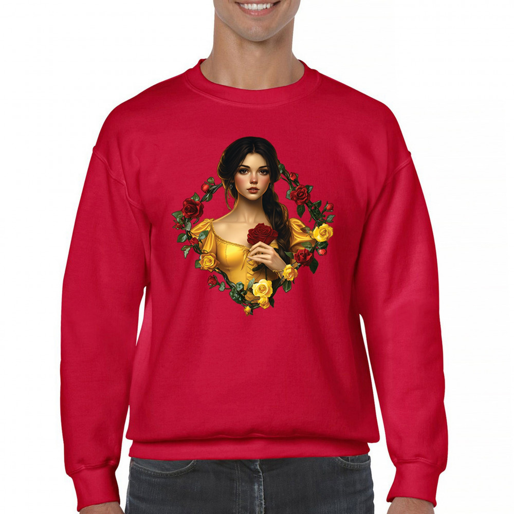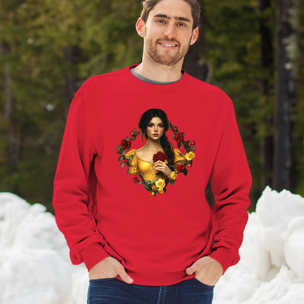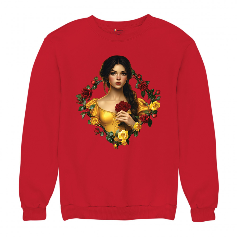 Inspired by classic fairytales, this design features a girl in a yellow gown holding a red rose, framed by rich red and yellow roses. A tribute to Beauty and the Beast, it radiates warmth, romance, and timeless fantasy. Perfect for storybook lovers, enchanted art collectors, or those drawn to magical, symbolic imagery filled with beauty and grace.