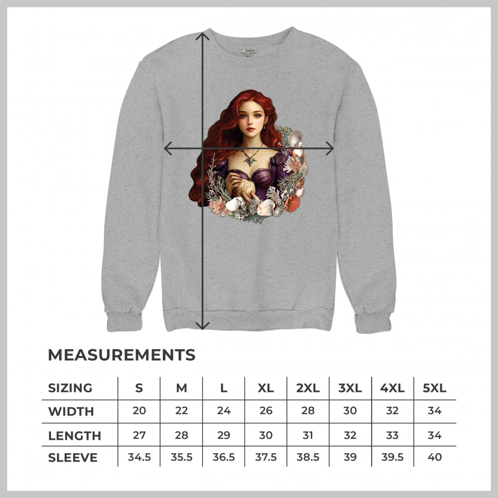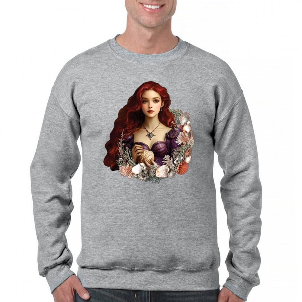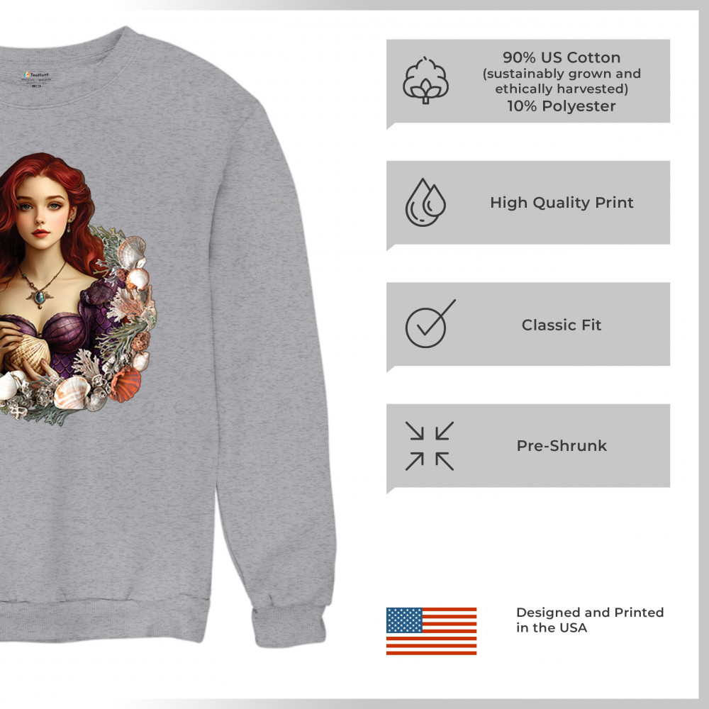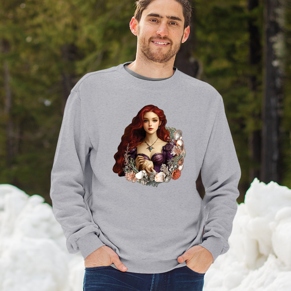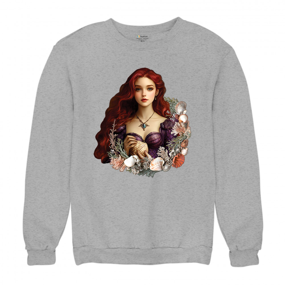 Inspired by mystical ocean themes, this design features a fantasy red-haired girl in a seashell dress, cradling a large shell. She is framed by coral, seaweed, and a shimmering array of ocean shells. With nods to classic mermaid lore and fairytale storytelling, it's perfect for fans of fantasy creatures, marine magic, and romantic ocean legends.