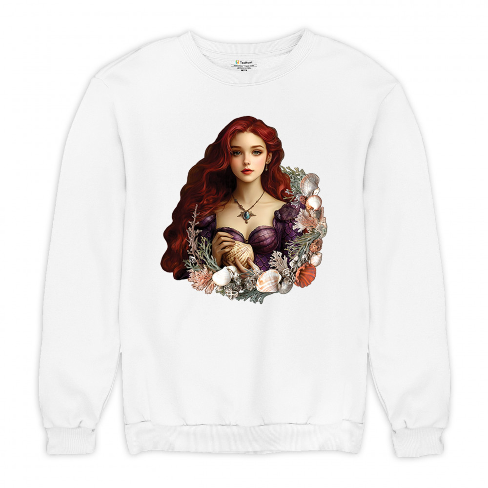 Inspired by mystical ocean themes, this design features a fantasy red-haired girl in a seashell dress, cradling a large shell. She is framed by coral, seaweed, and a shimmering array of ocean shells. With nods to classic mermaid lore and fairytale storytelling, it's perfect for fans of fantasy creatures, marine magic, and romantic ocean legends.