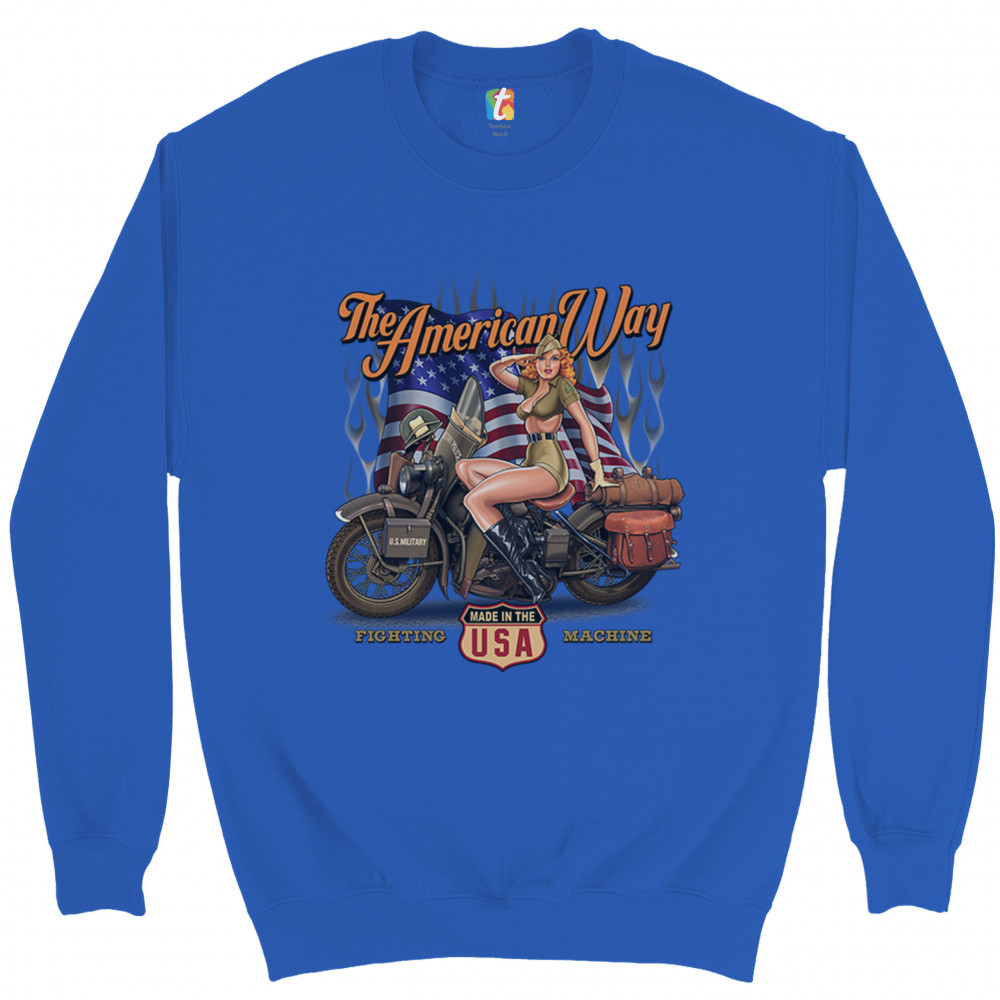 A print featuring a beautiful pin-up girl in leather boots sitting on a U.S. military motorcycle. There is the American Flag in the background and the words "The American Way" above it. At the bottom of the picture there is a shield which says: "made in the USA". "Fighting Machine" is written under the motorcycle's wheels. A great choice for a motorcycle enthusiast.