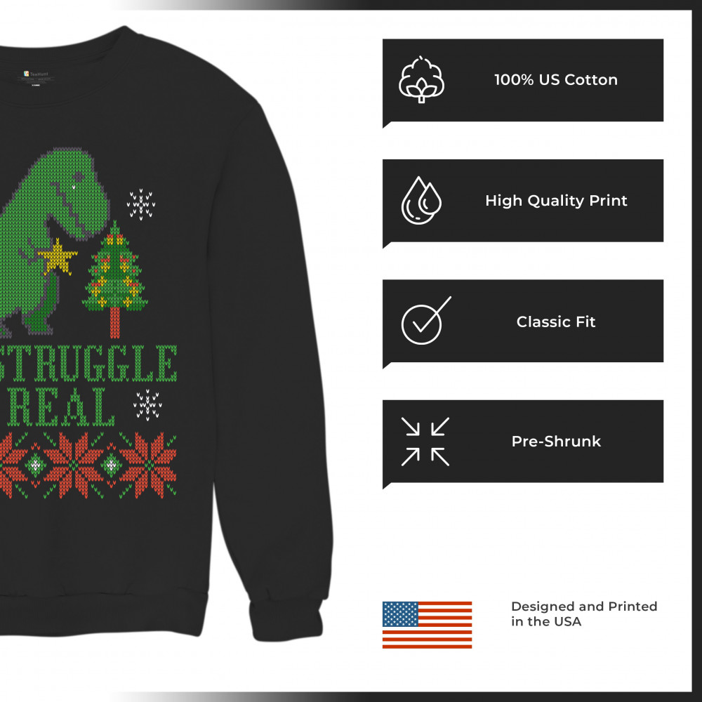 A funny print saying: "The Struggle Is Real" and featuring a sad tyrannosaurus rex holding a toy star in it's short hands standing by a Christmas tree. The print is decorated as an ugly sweater. Amazing choice to make people smile and spread positive vibe