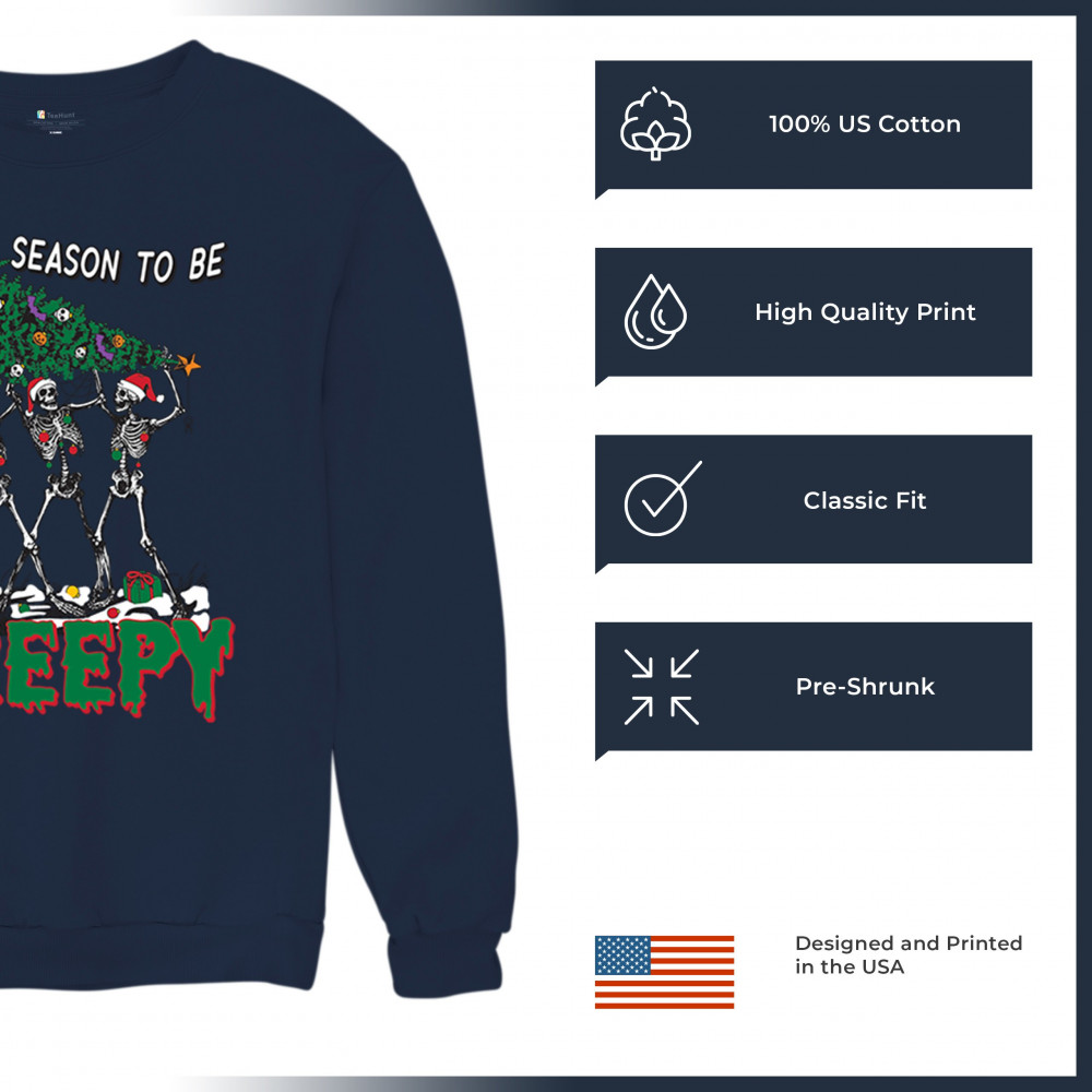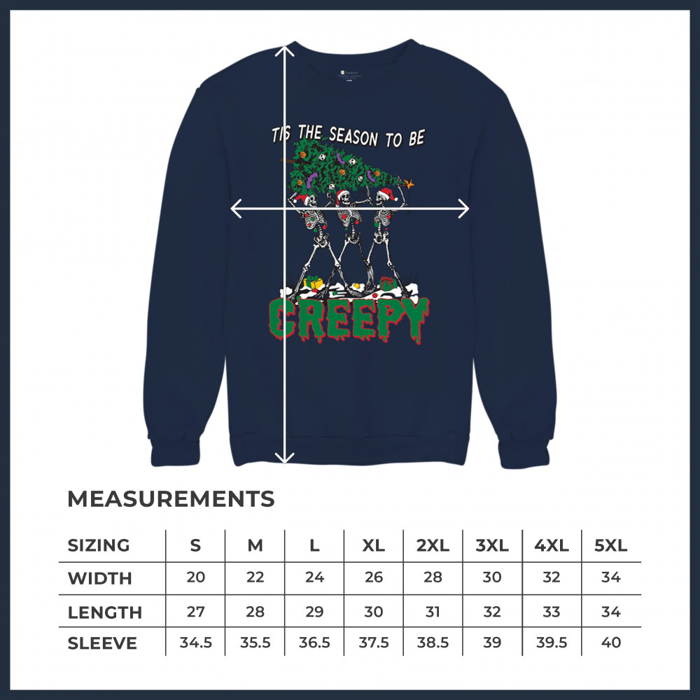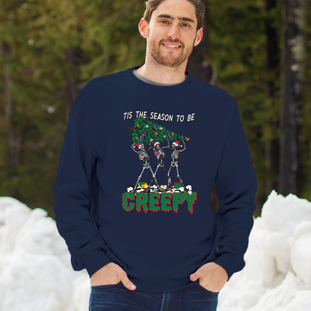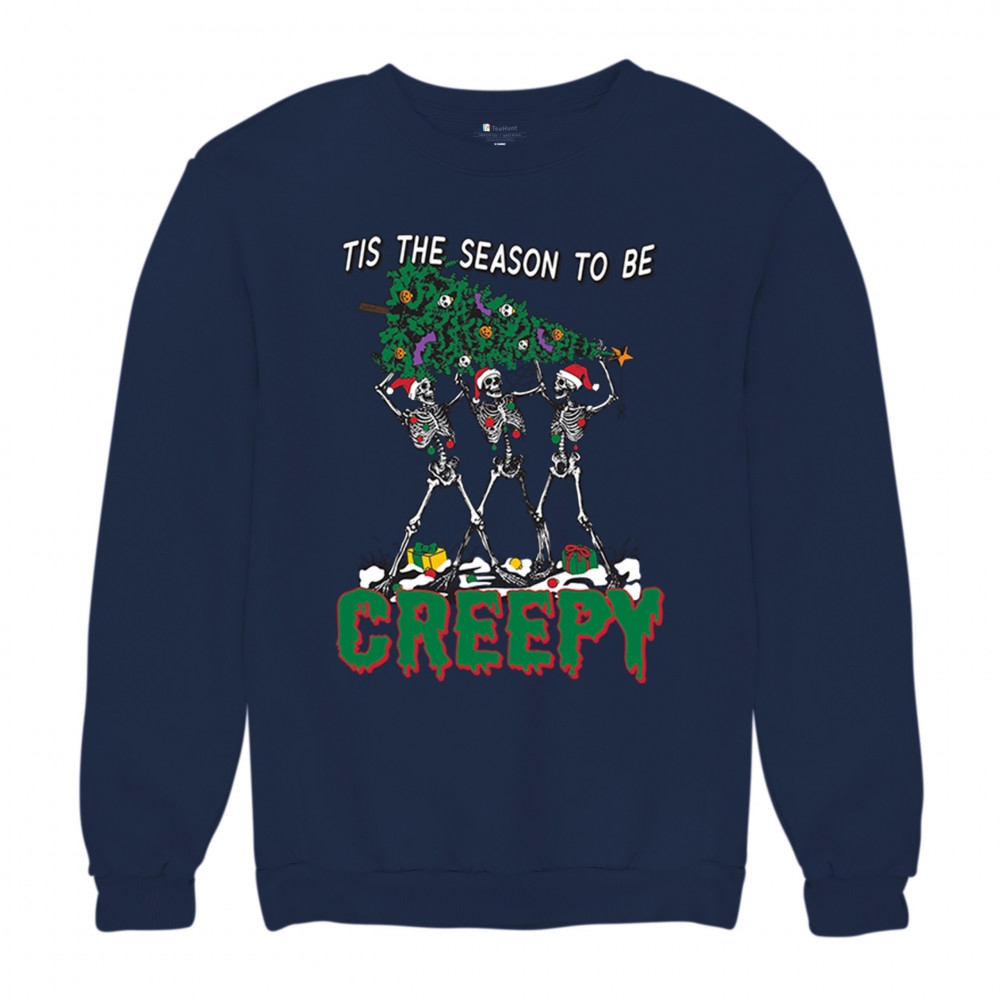 "Tis the Season to Be Creepy" combines holiday cheer with a hauntingly fun twist. This creative design features skeletons donning Santa hats as they carry a spooky Christmas tree decorated with eerie ornaments. Perfect for holiday gatherings, Secret Santa gifts, or themed parties, this design celebrates the festive and the macabre. Embrace the jolliest and creepiest bunch this season with this standout apparel.