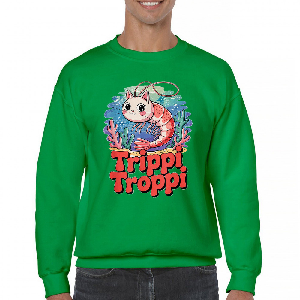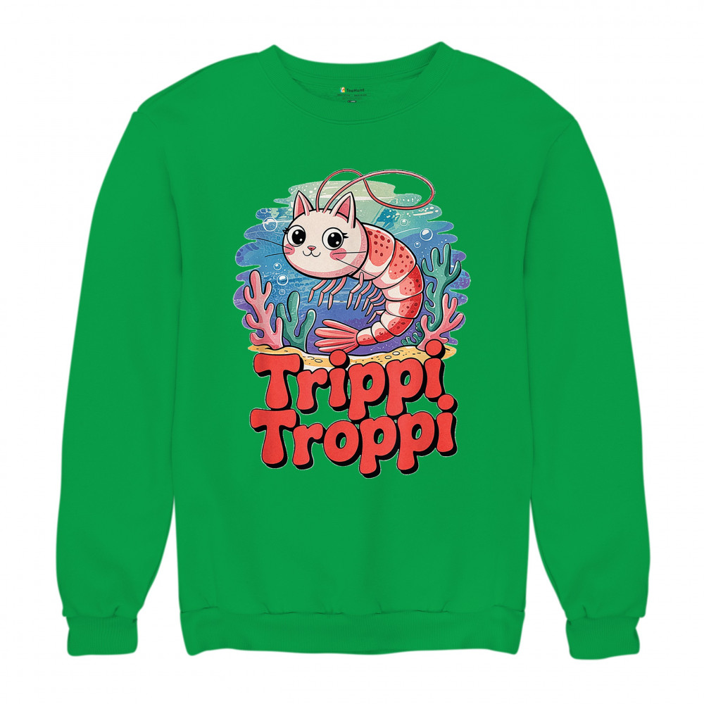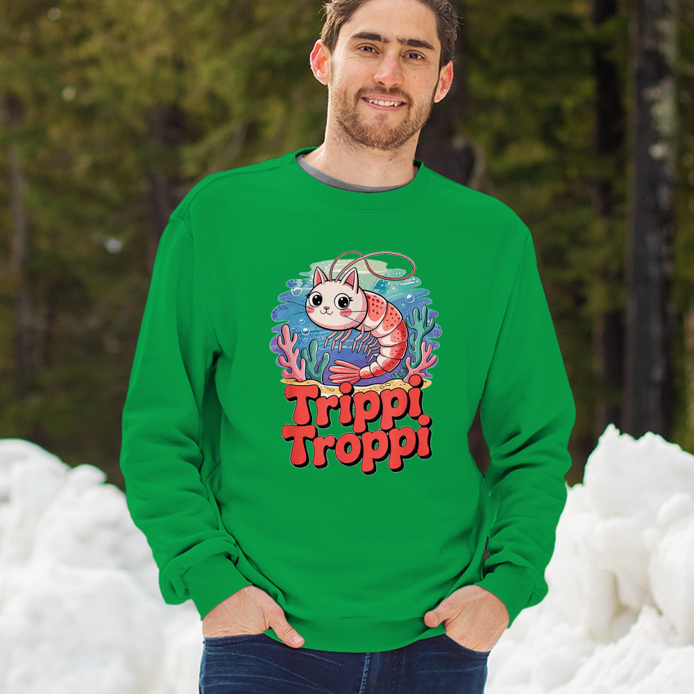 Dive deep into absurdity with Trippi Troppi—a surreal shrimp-cat fusion straight out of Italian Brainrot territory. This design captures cursed animal chaos, weirdcore visuals, TikTok meme culture, and underwater fever dream aesthetics. Made for Gen Z humor addicts, ocean meme fans, and ironic fashion lovers alike.