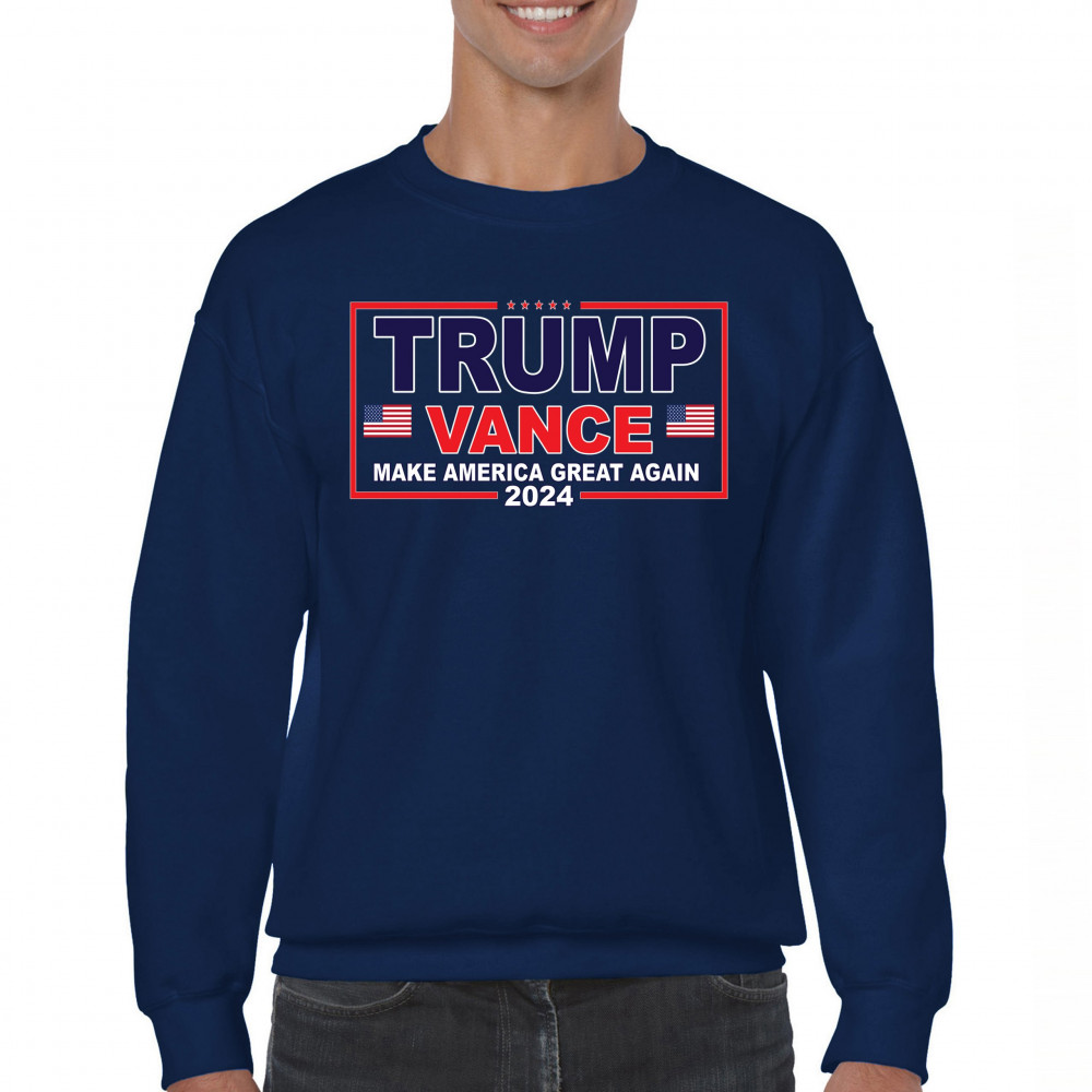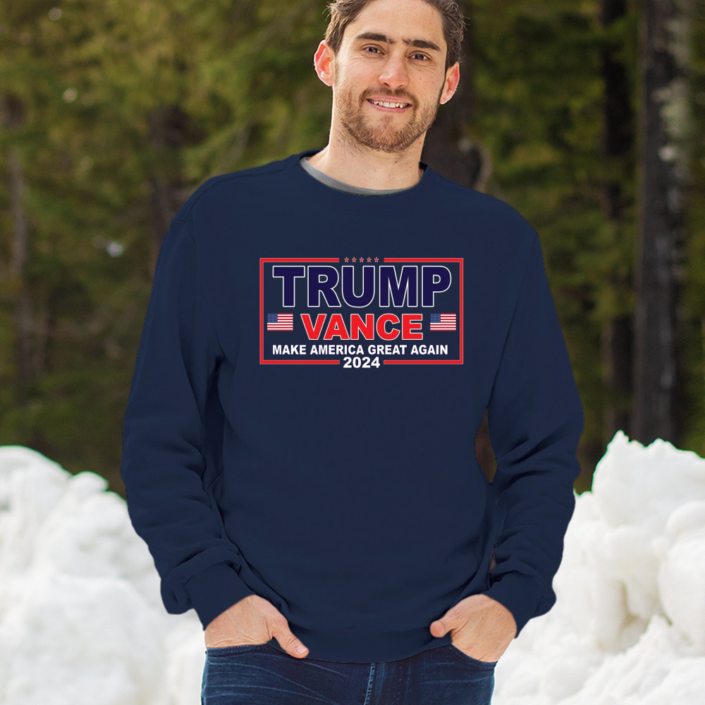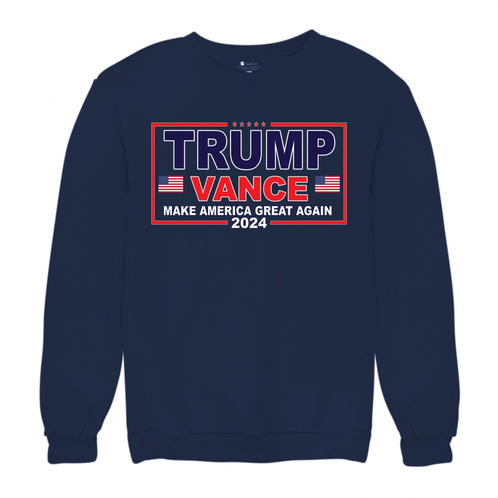 Showcase your support for the Trump-Vance 2024 campaign with this bold patriotic design featuring the American flag and "Make America Great Again" slogan.