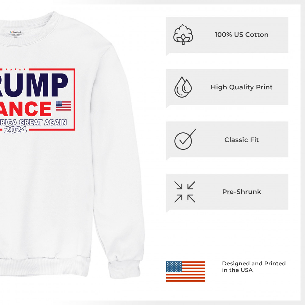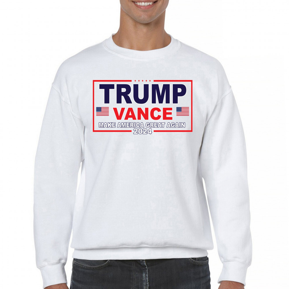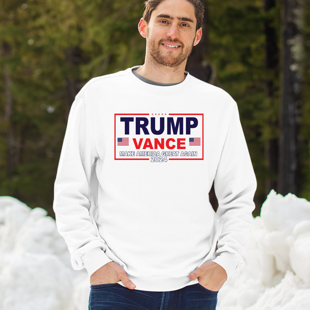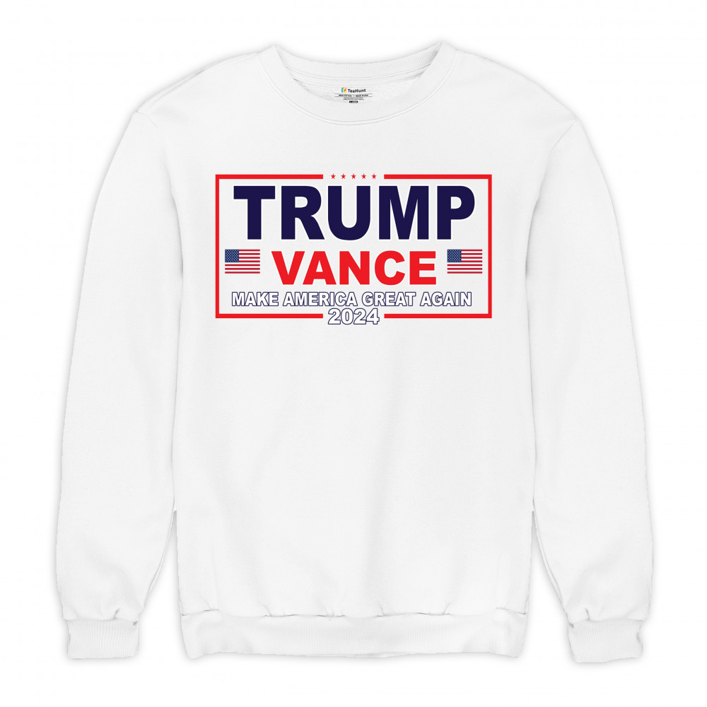 Showcase your support for the Trump-Vance 2024 campaign with this bold patriotic design featuring the American flag and "Make America Great Again" slogan.