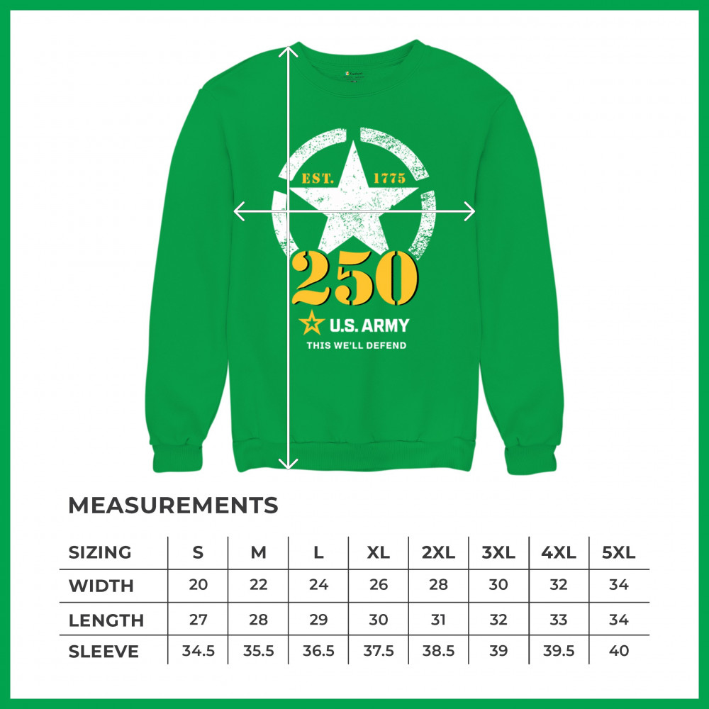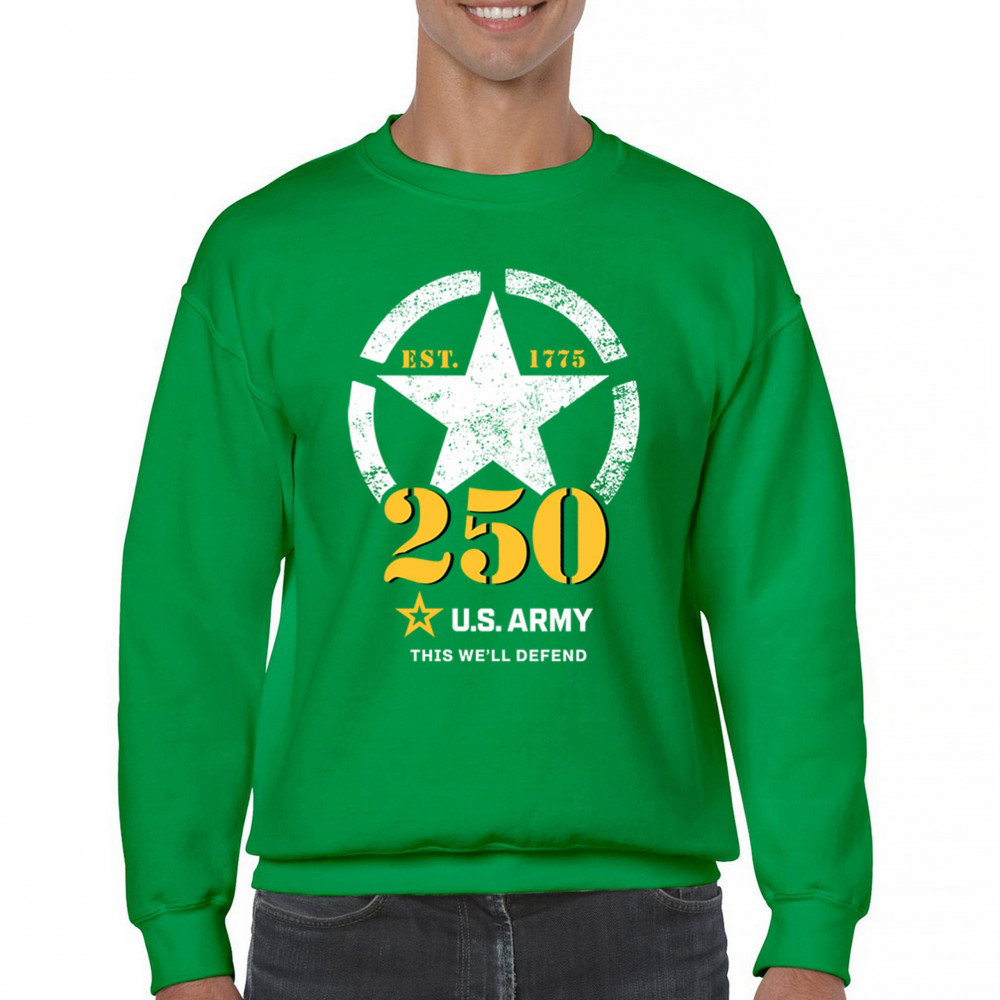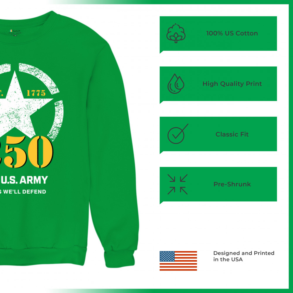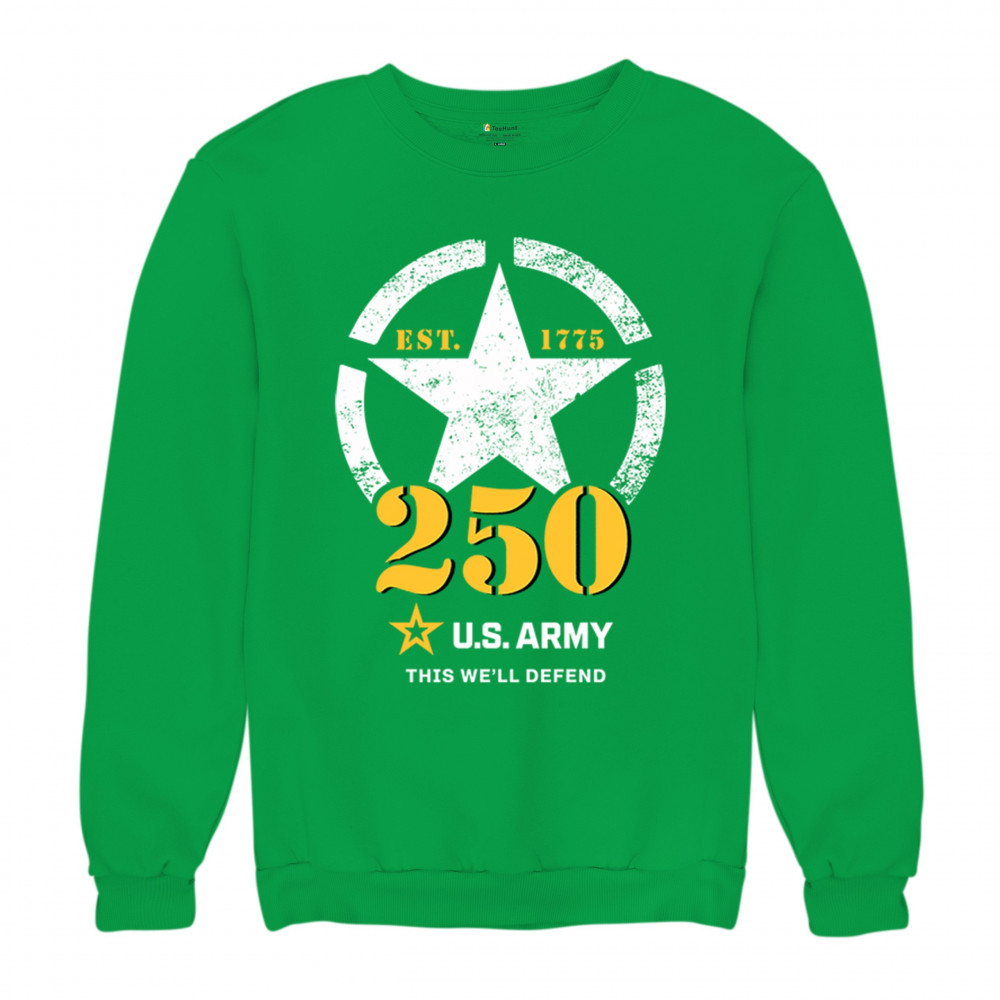 Celebrate 250 years of U.S. Army duty and pride with bold stencil design, EST 1775 mark, and patriotic “This We’ll Defend†motto.