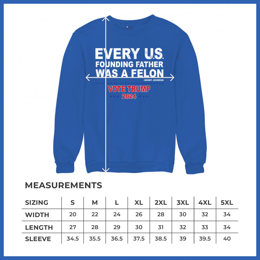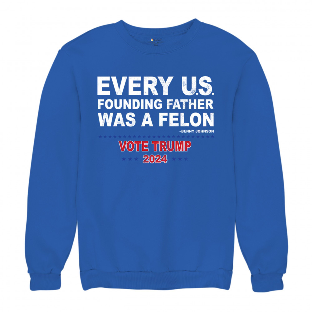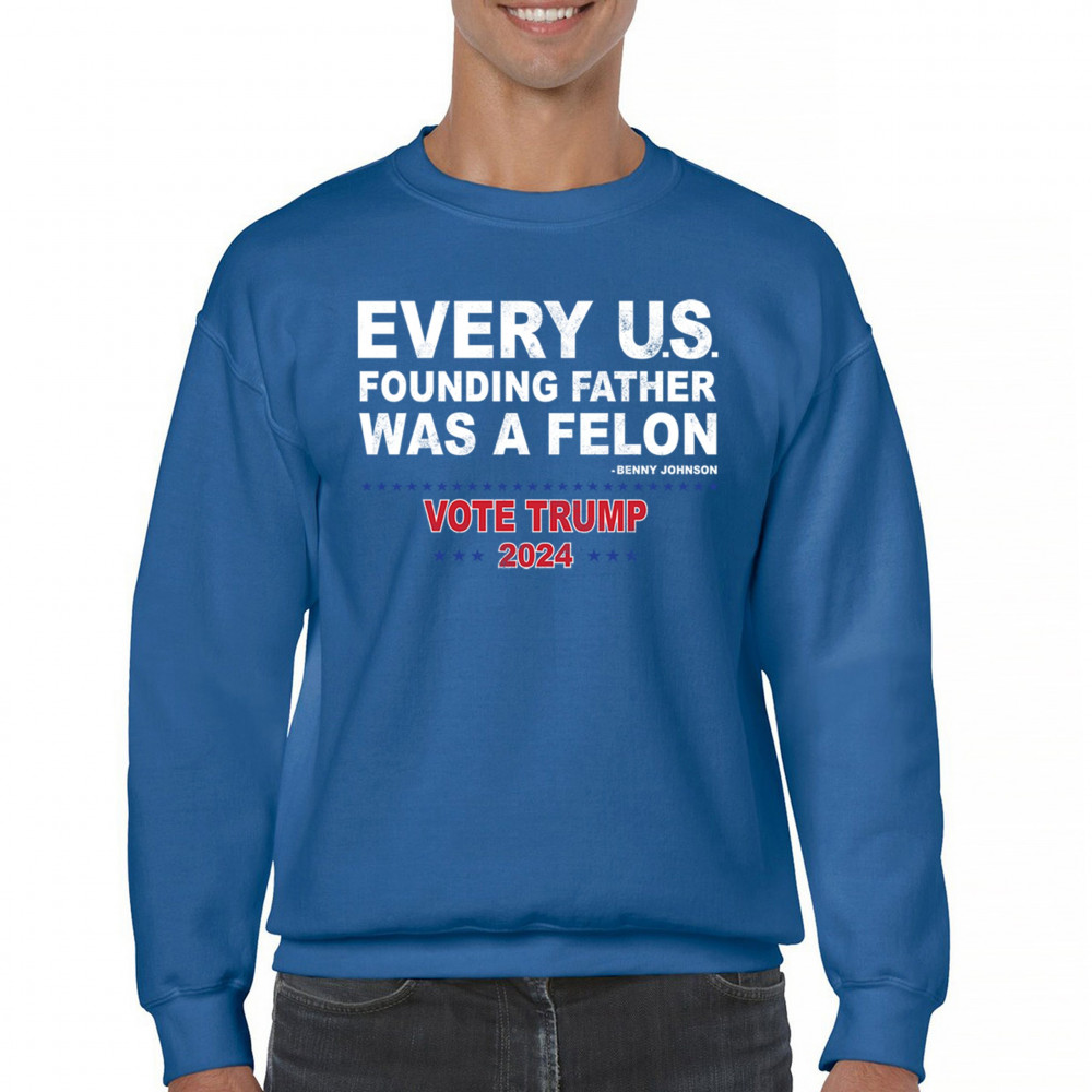 Show your support for Trump 2024 with a bold design quoting "Every U.S. founding father was a felon." Stand against political attacks and support an America-first vision.