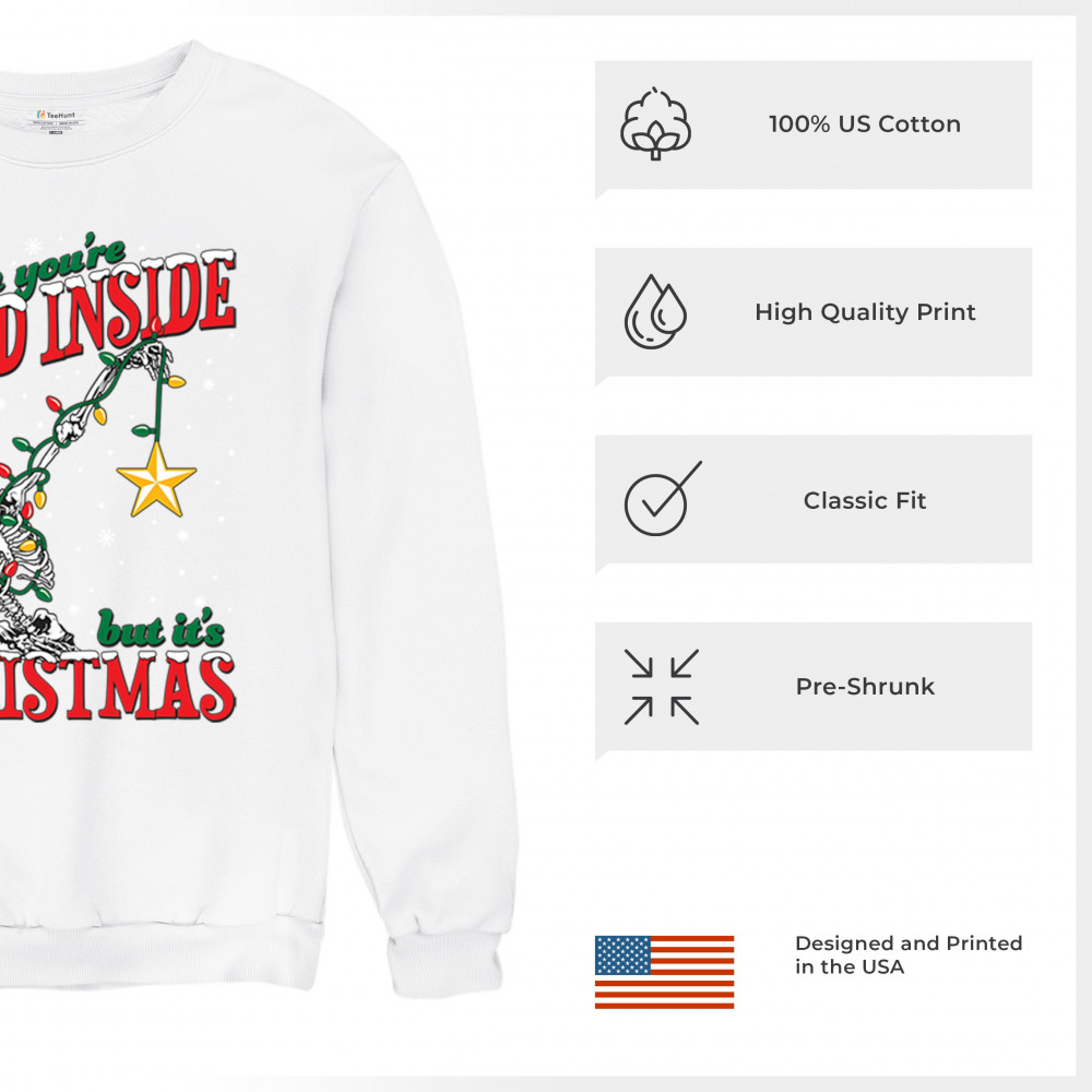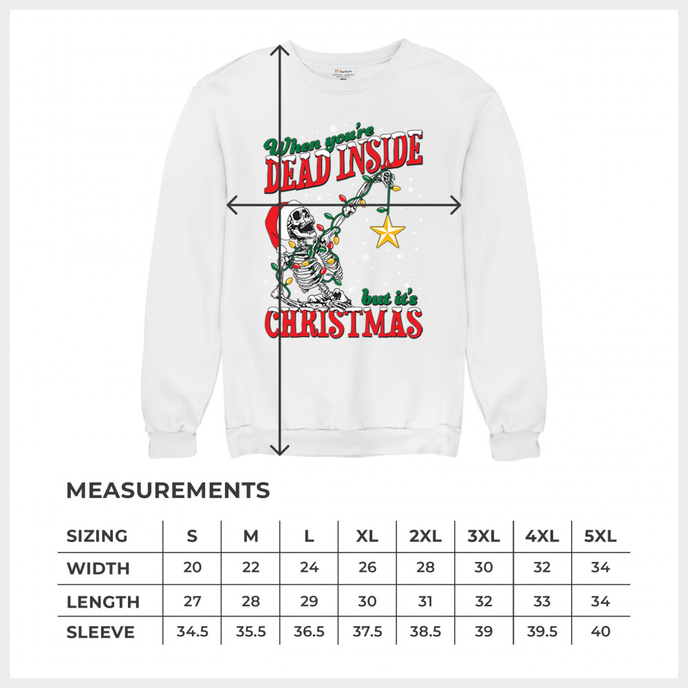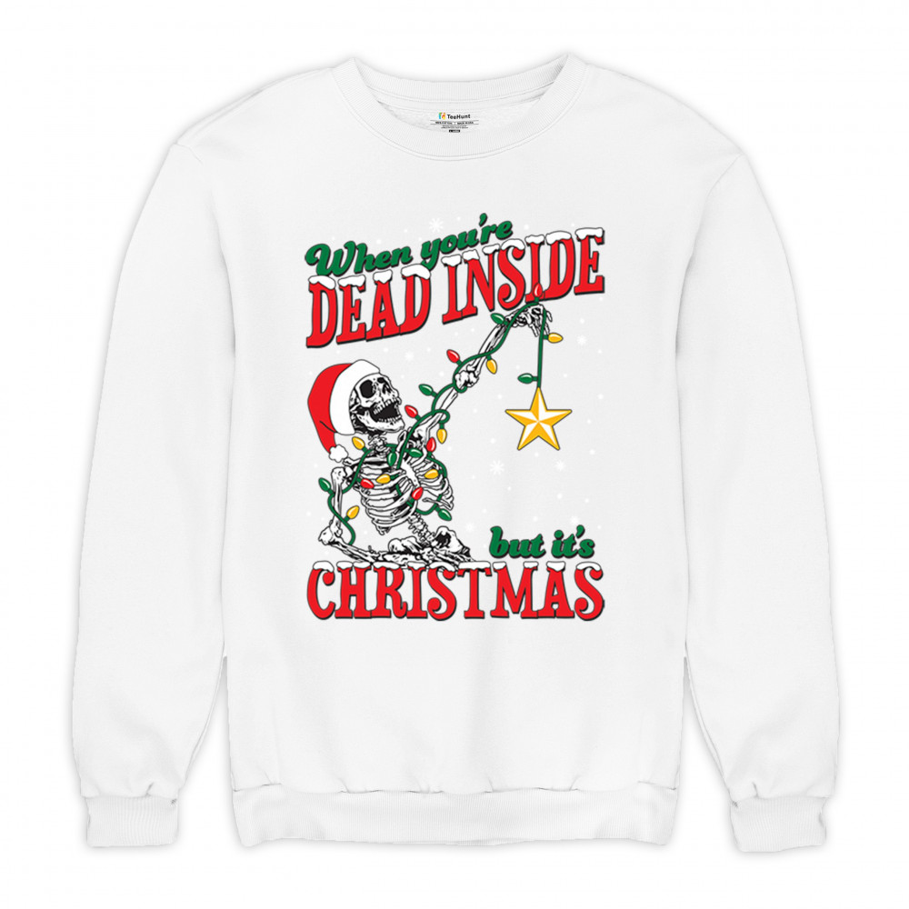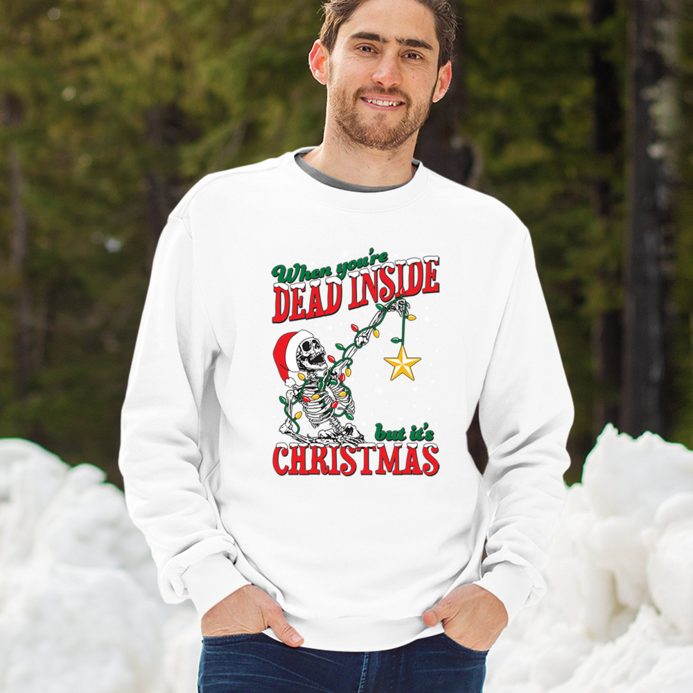 Bring humor and uniqueness to your holiday wardrobe with the "When You're Dead Inside But It's Christmas" design. This quirky creation features a skeleton embracing the festive spirit with colorful lights, a Santa hat, and a glowing star. Ideal for Secret Santa exchanges, ugly sweater parties, or anyone who loves blending a touch of humor with Christmas tradition. Celebrate the season in style with this unforgettable design.