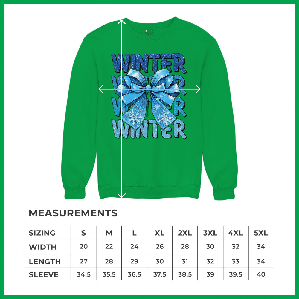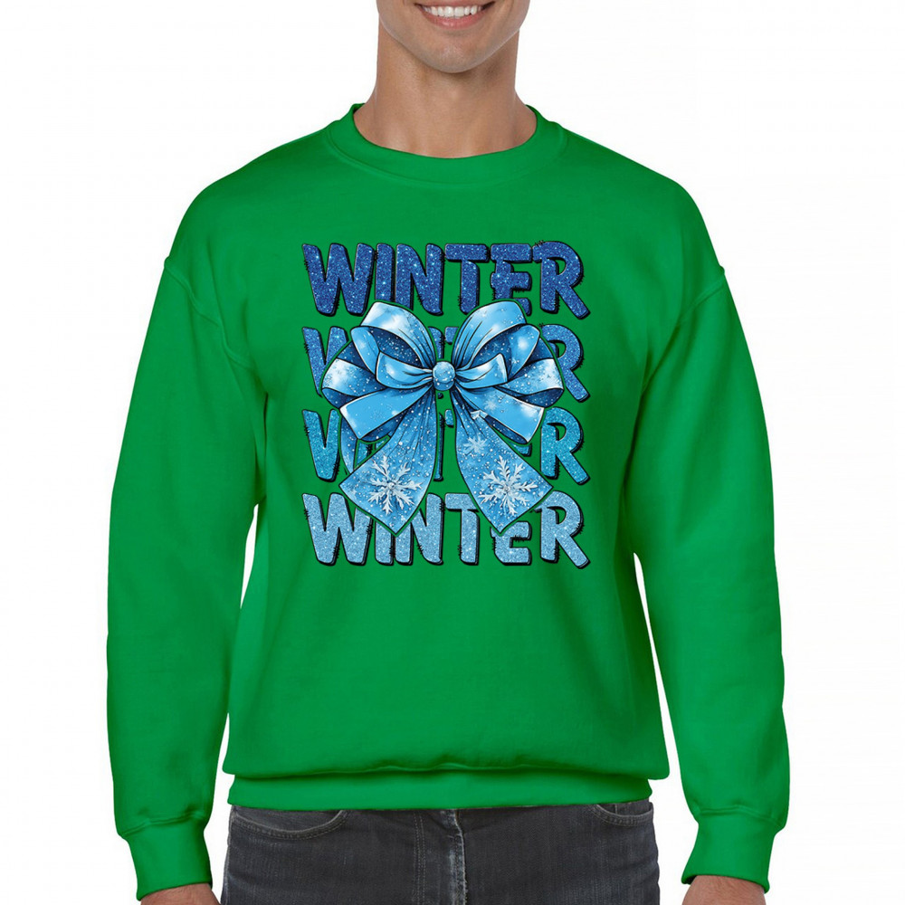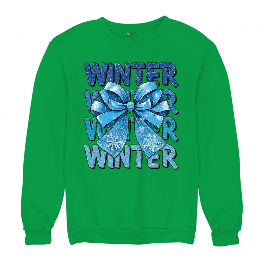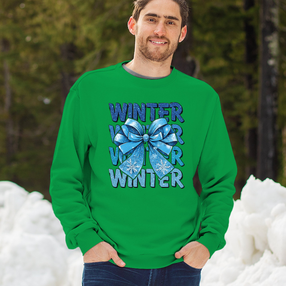 This shimmering winter bow design blends icy blue glitter style with bold repeating WINTER text for a bright seasonal statement. Snowflake accents and frosty tones create a cozy, cheerful vibe perfect for holiday outfits, gifting, or cold-weather lovers. A standout graphic that brings festive winter charm to any wardrobe and boosts seasonal search visibility.