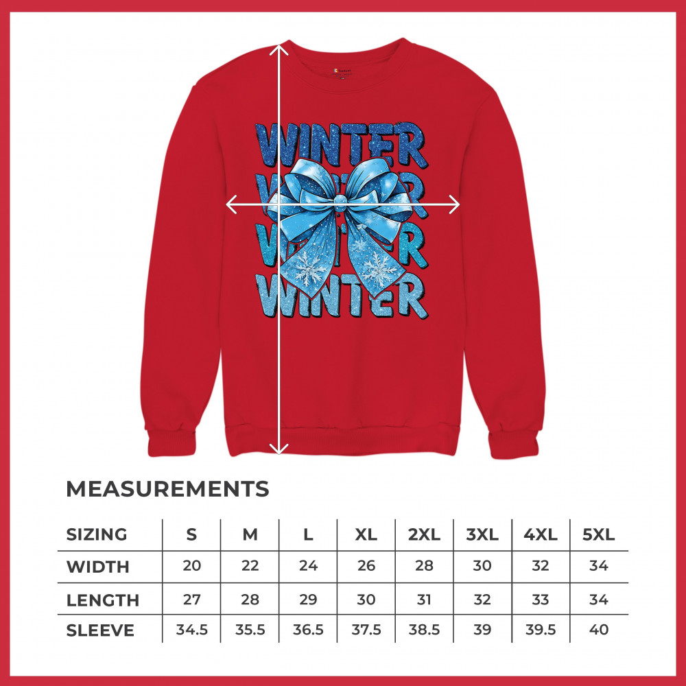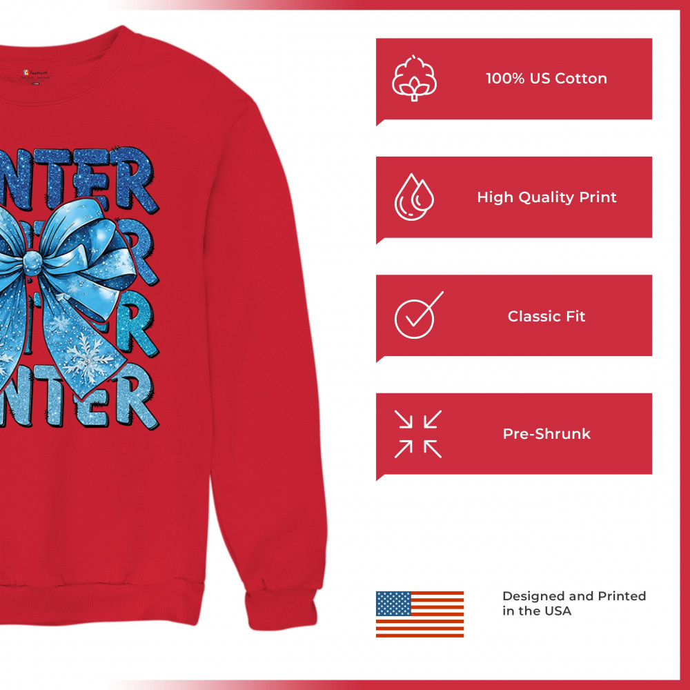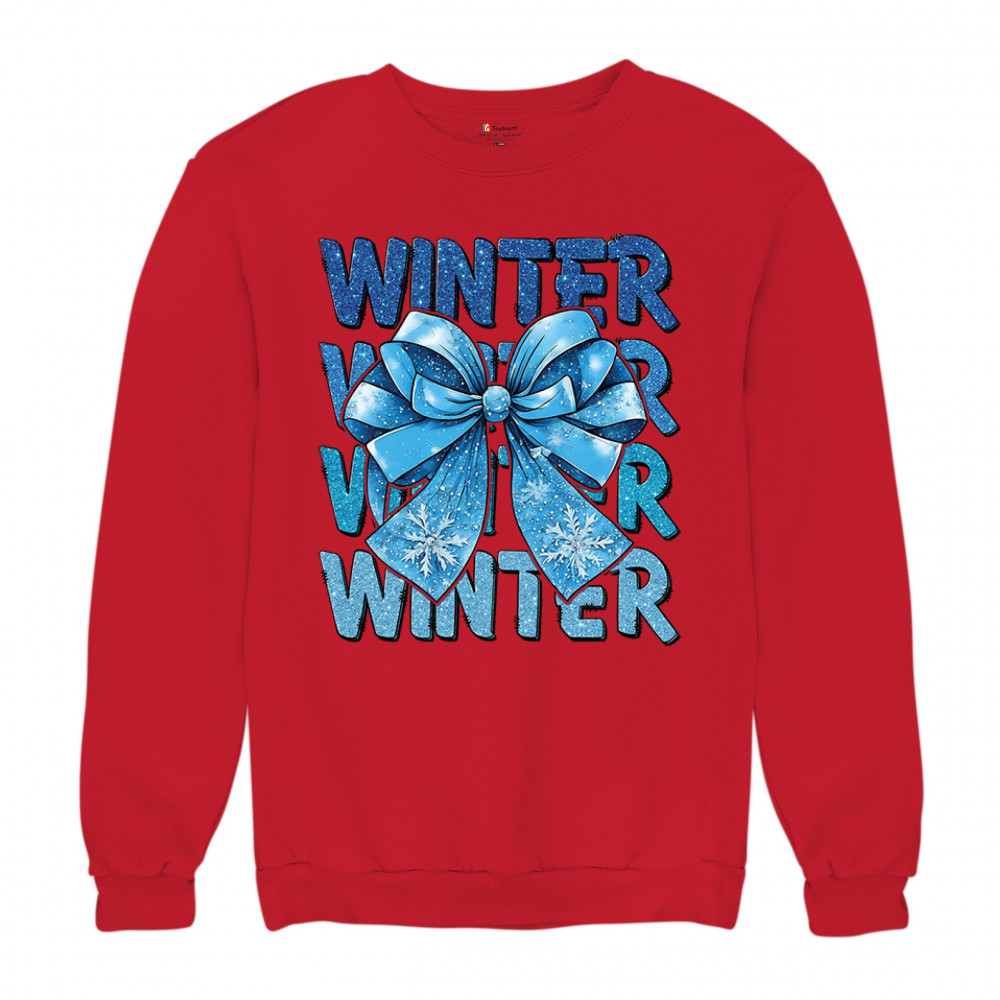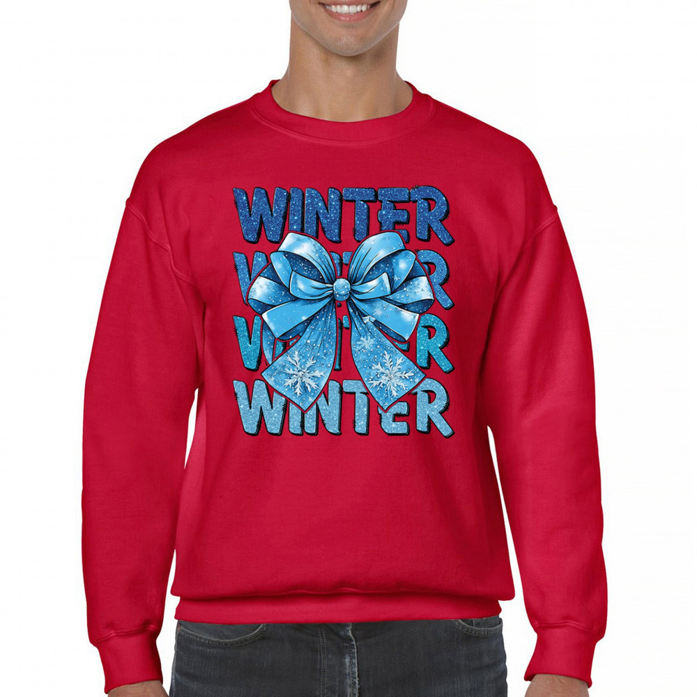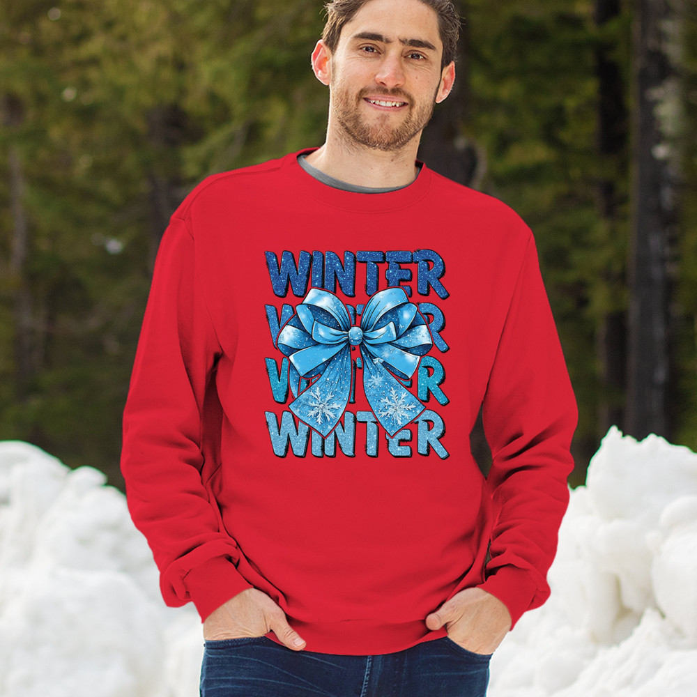This shimmering winter bow design blends icy blue glitter style with bold repeating WINTER text for a bright seasonal statement. Snowflake accents and frosty tones create a cozy, cheerful vibe perfect for holiday outfits, gifting, or cold-weather lovers. A standout graphic that brings festive winter charm to any wardrobe and boosts seasonal search visibility.