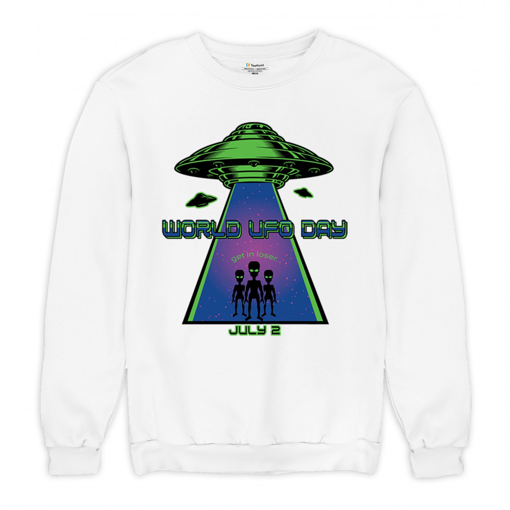 Celebrate World UFO Day with a vibrant design featuring a UFO and three playful aliens with "Get in, loser." Perfect for UFO enthusiasts and alien humor lovers.