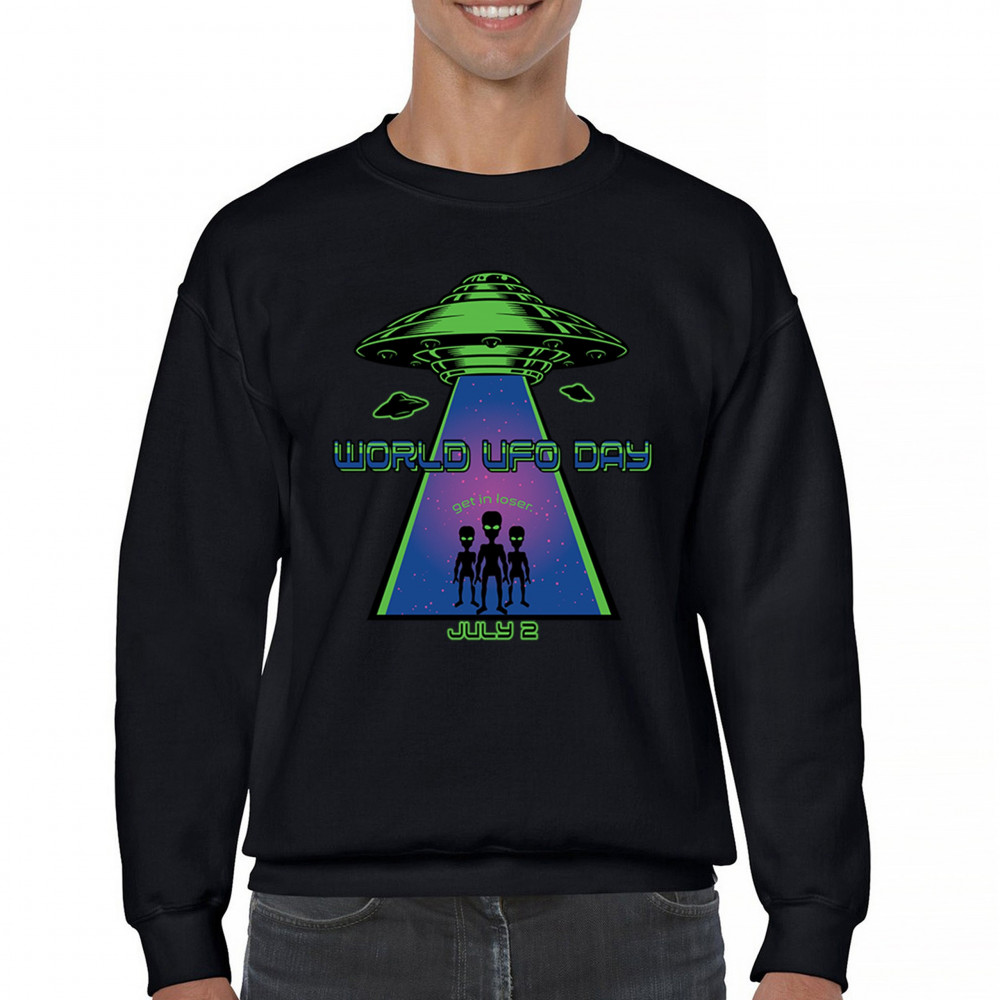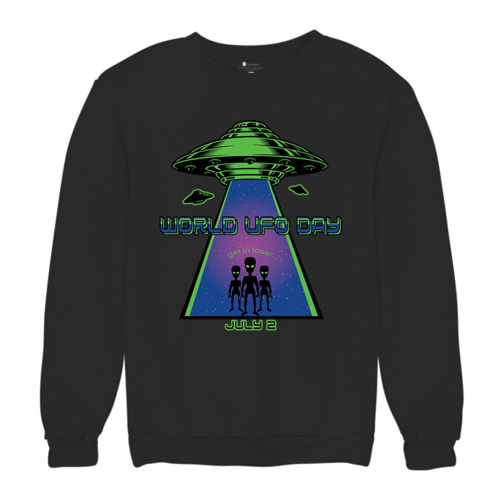 WORLD UFO DAY GET IN LOSER sweatshirt funny aliens flying saucer space crewneck black