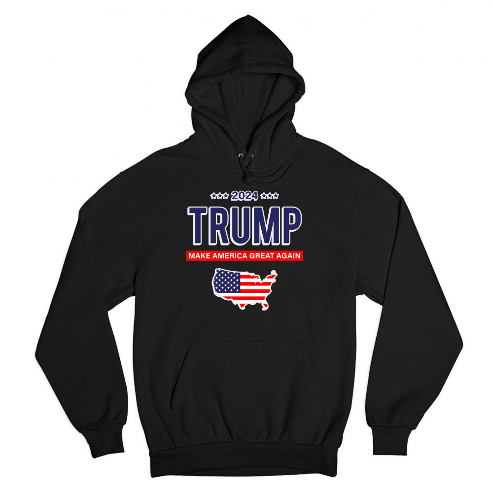 A political print saying "2024 Trump Make America Great Again" and features the silhouette of the USA with the American flag inside of it. A great choice to wear for a Trump rally or give as a gift to a Donald Trump supporter before 2024 presidential elec