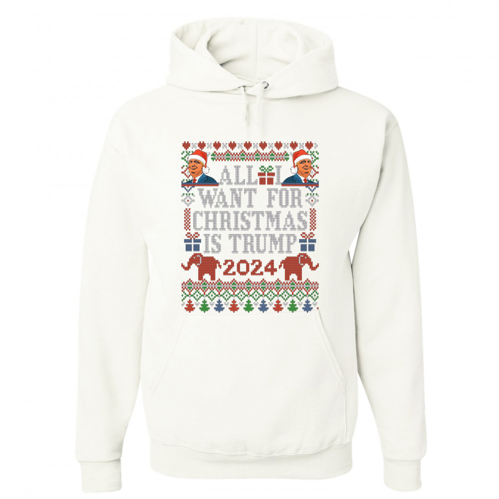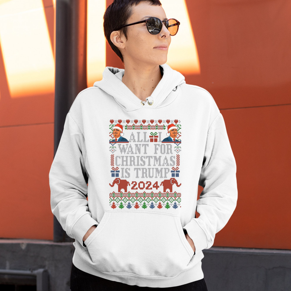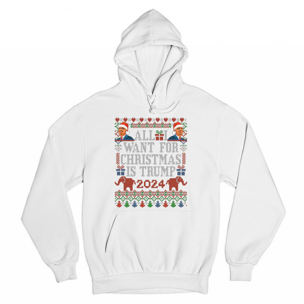 A funny print saying: "All I Want for Christmas Is Trump 2024". The print is decorated as a Christmas ugly sweater and features faces of Donald Trump wearing Christmas hats and two elephants. A great choice to wear for a Christmas or New Year's Eve party