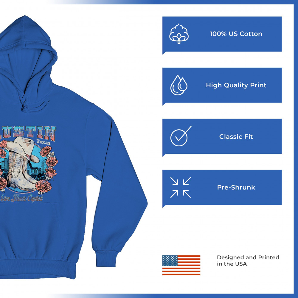 Austin TX Live Music Capital comes alive in this vintage cowgirl boots and hat design, accented by roses and the city skyline. Perfect for lovers of country music, honkytonk vibes, and western chic, this design embodies southern spirit, rustic grit, and the proud Americana aesthetic of Texas’ iconic music scene.